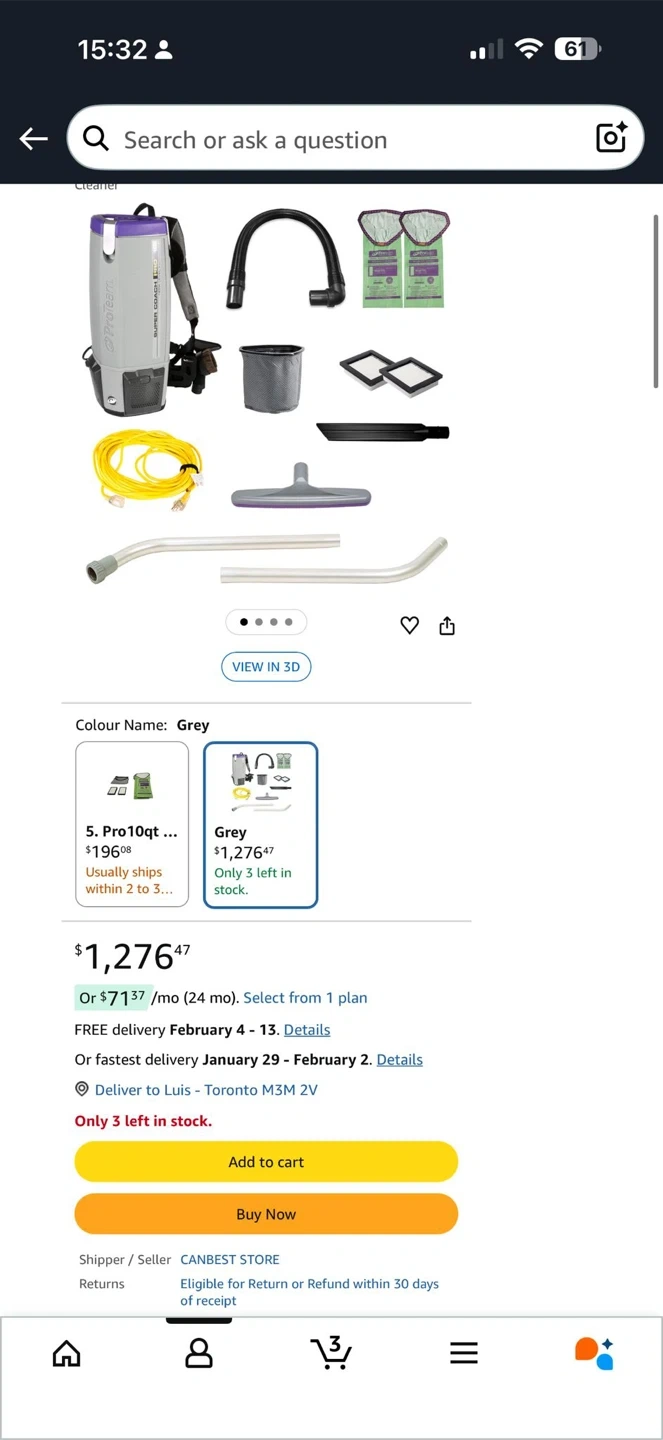 Includes vacuum, hose, extension wands, floor tool, and crevice tool.