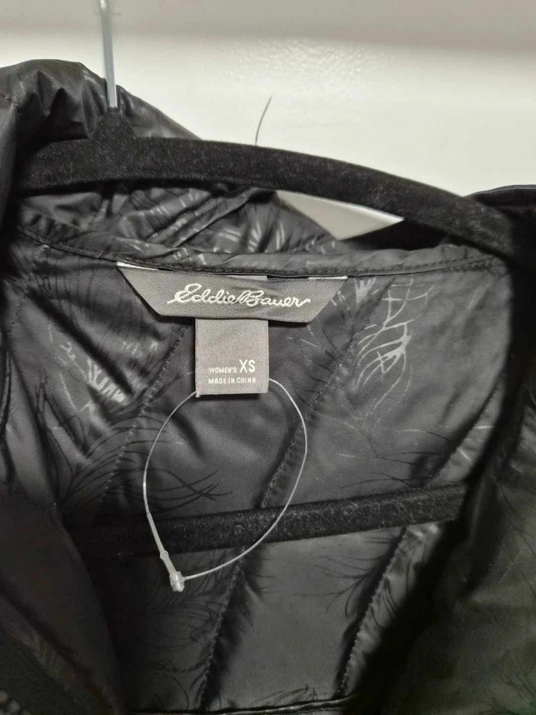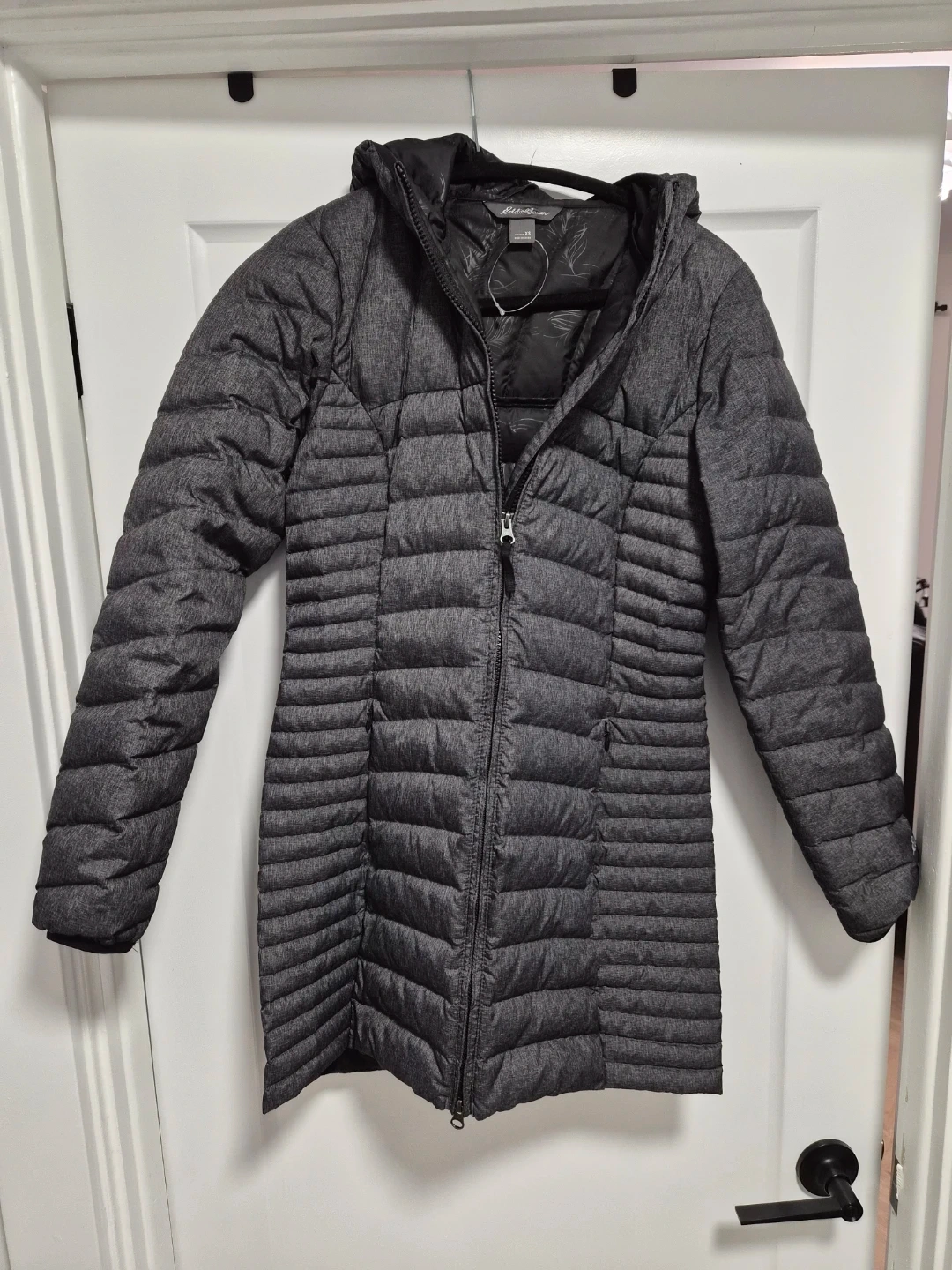 Eddie Bauer women's insulated parka. Women's size XS. It's a dark grey heathered exterior with a black quilted interior lining. It has a full zip closure and a hood.