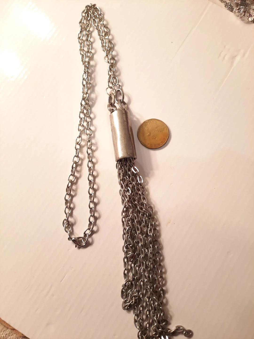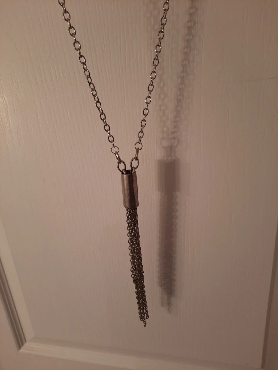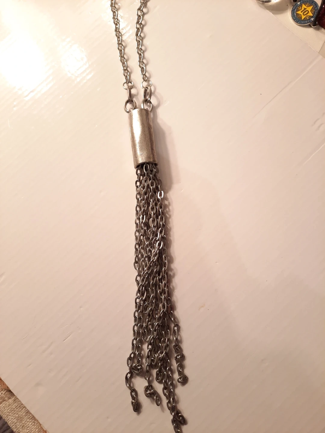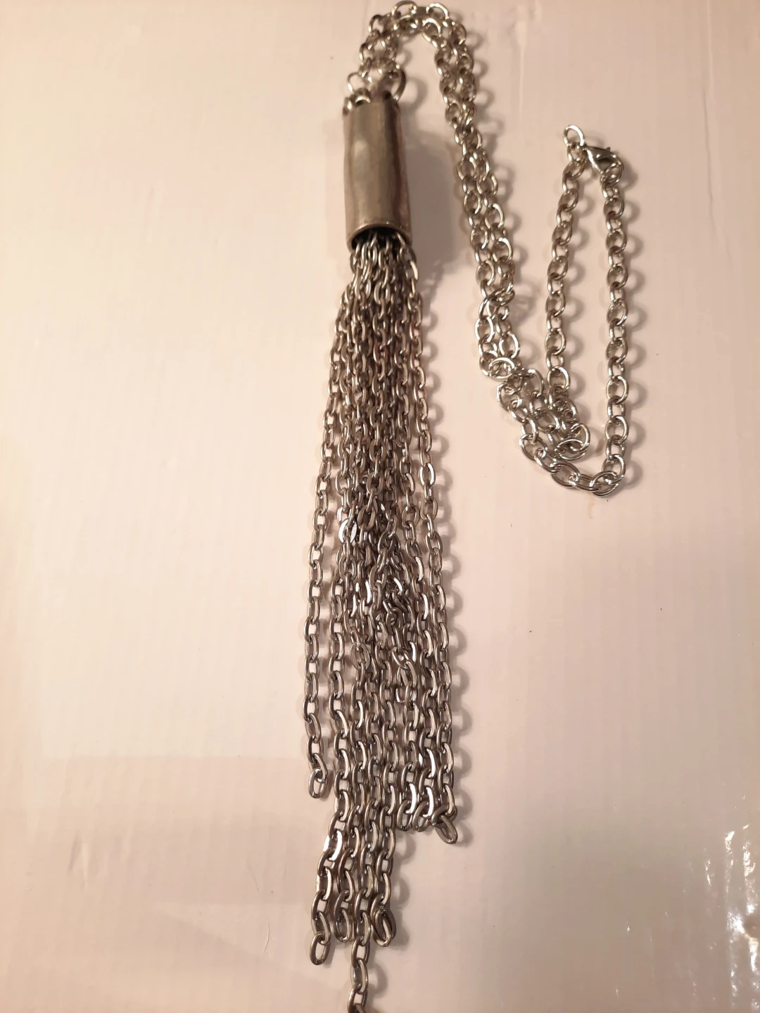 This silver-tone necklace features a long chain with a cylindrical pendant adorned with multiple dangling chains, creating a tassel effect. It's approximately 20 inches long with a 3-inch tassel drop. This piece adds a touch of bohemian flair to any outfit!not new,gently used,one of a kind ,outstanding piece.