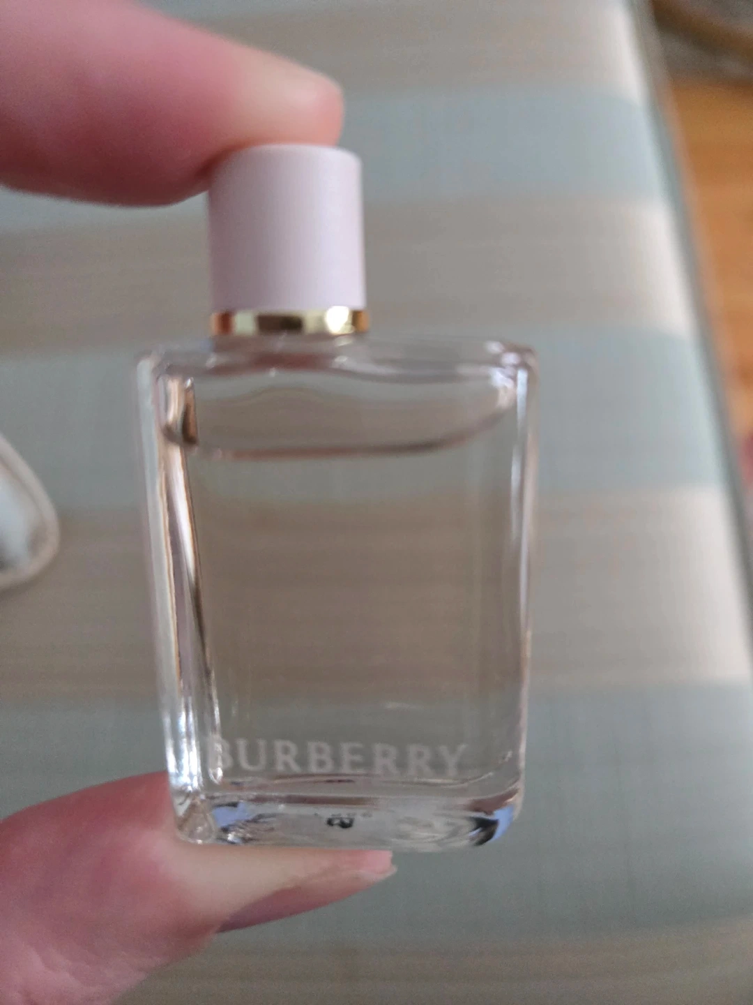 A miniature bottle of Burberry Her perfume. It's a travel-sized fragrance with a pale pink cap. Perfect for trying out or for travel!