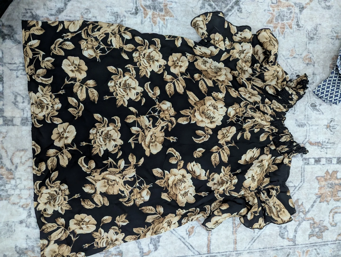 A lovely black maxi skirt with a beige floral print. It features a gathered elastic waistband for comfort. The flowy design makes it a great option for warmer weather! Large