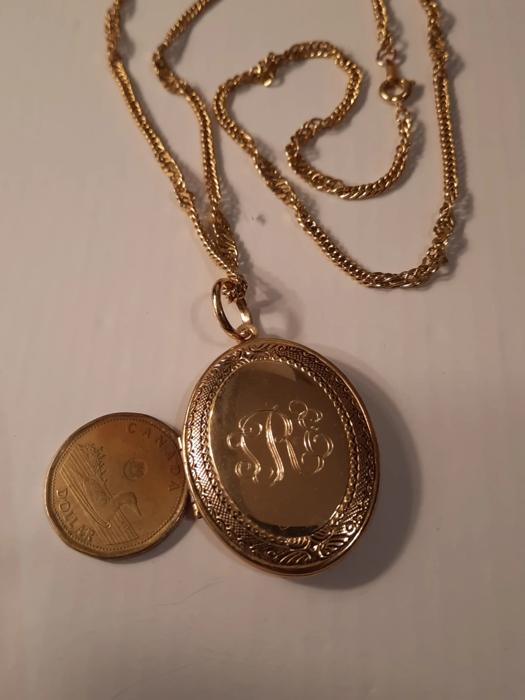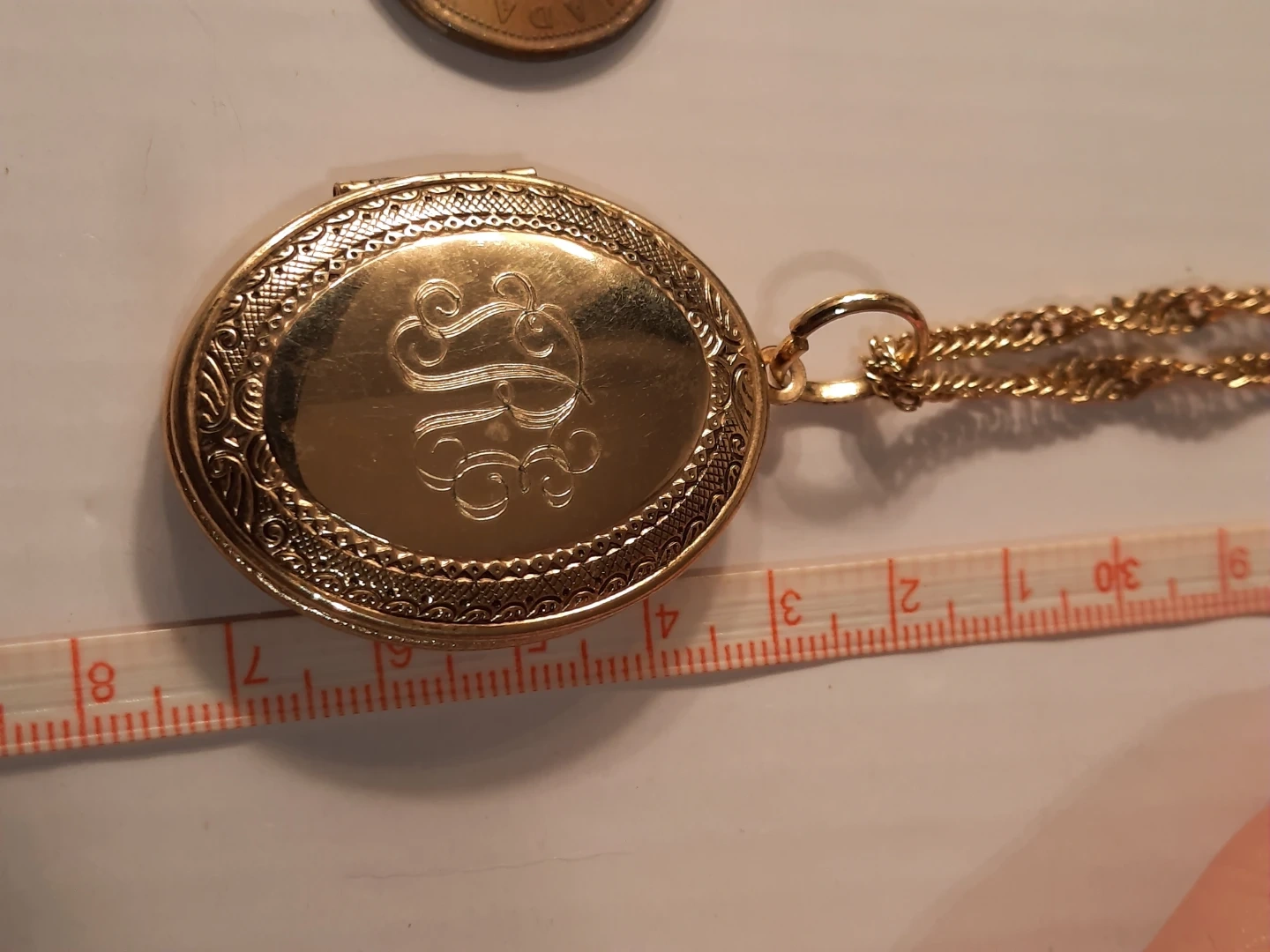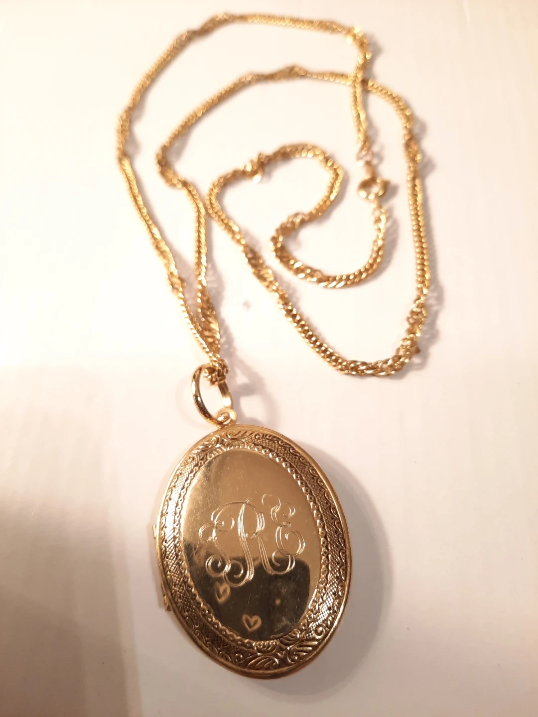 A beautiful oval locket necklace with a gold tone finish. It features an ornate embossed border and a monogram in the front. The locket opens to hold photos. A classic piece to add to any jewellery collection!large locket.