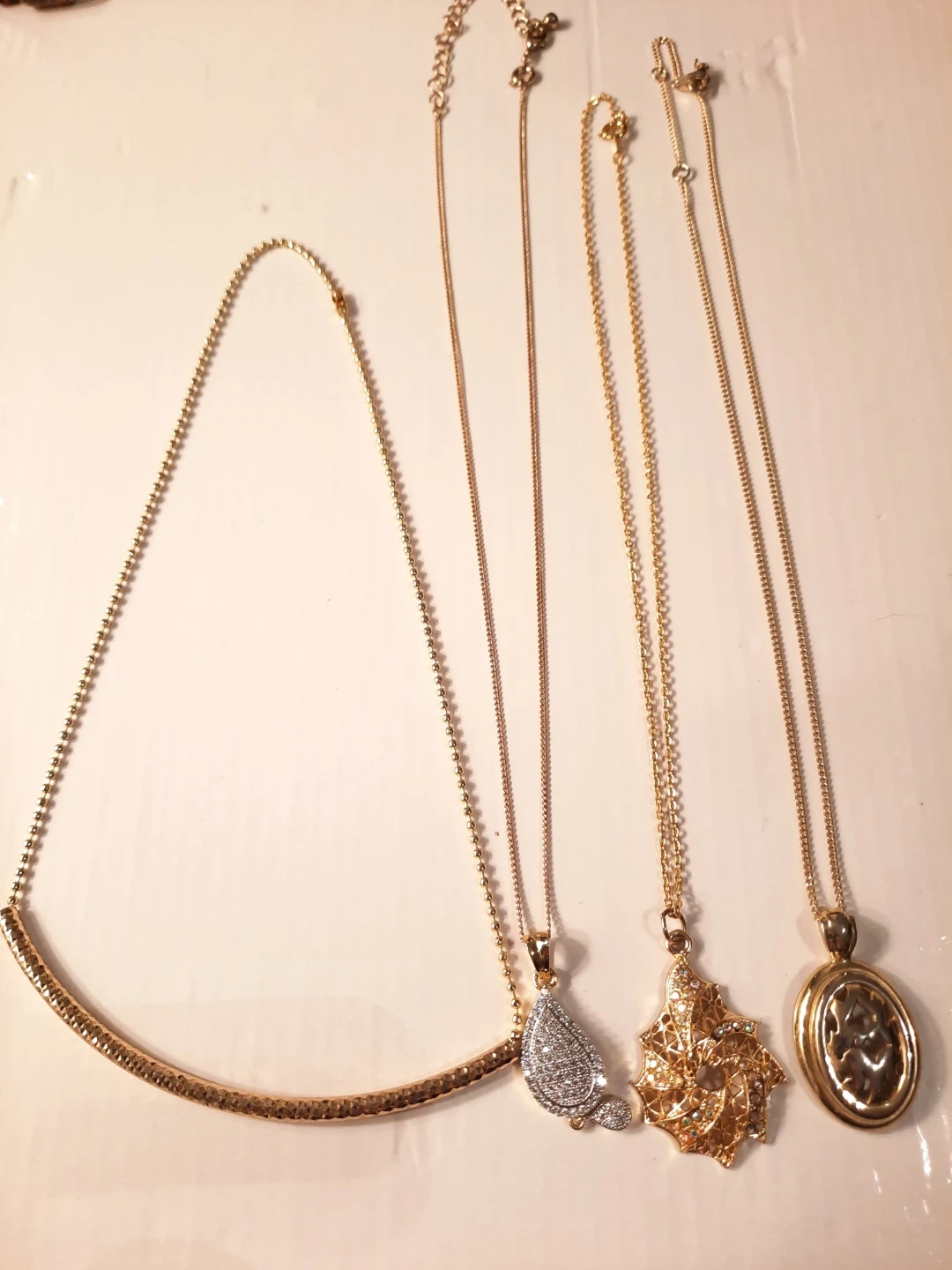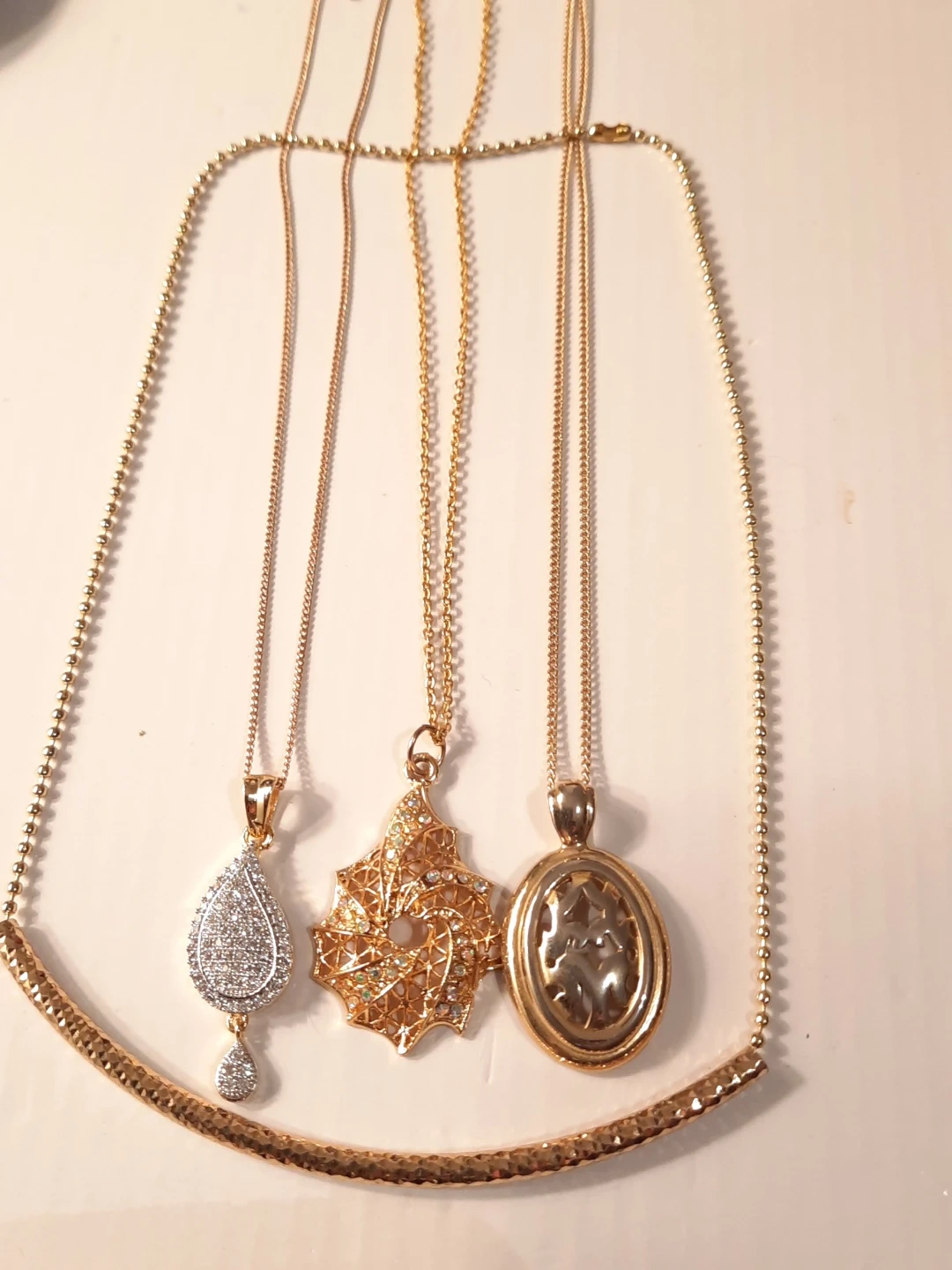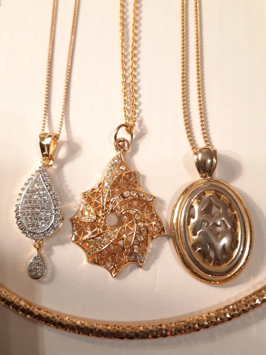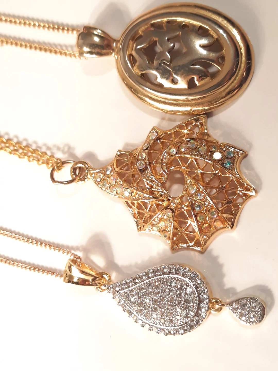 A collection of gold-tone necklaces, each with a unique pendant. One pendant is a teardrop shape covered in clear stones, another has an intricate starburst design with small stones, and the third is an oval pendant with an embossed pattern,and one tubular around the neck.. They're perfect for adding a bit of sparkle to any outfit!not new,but great condition