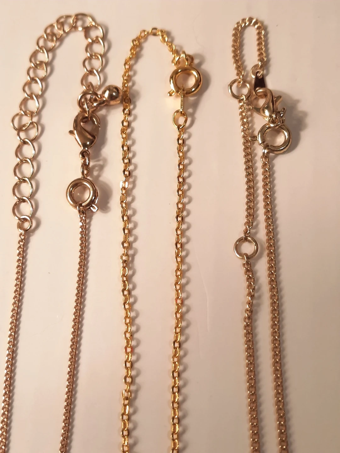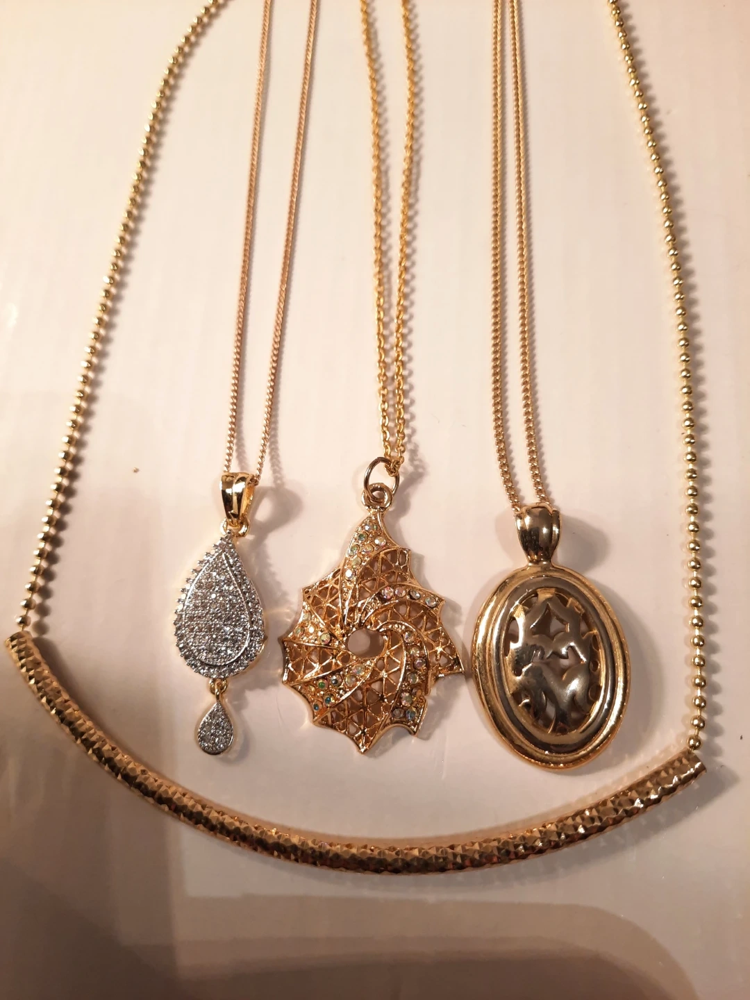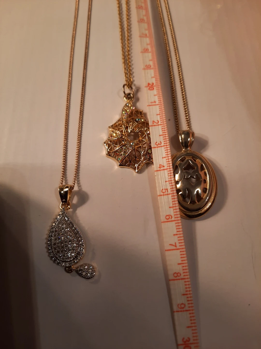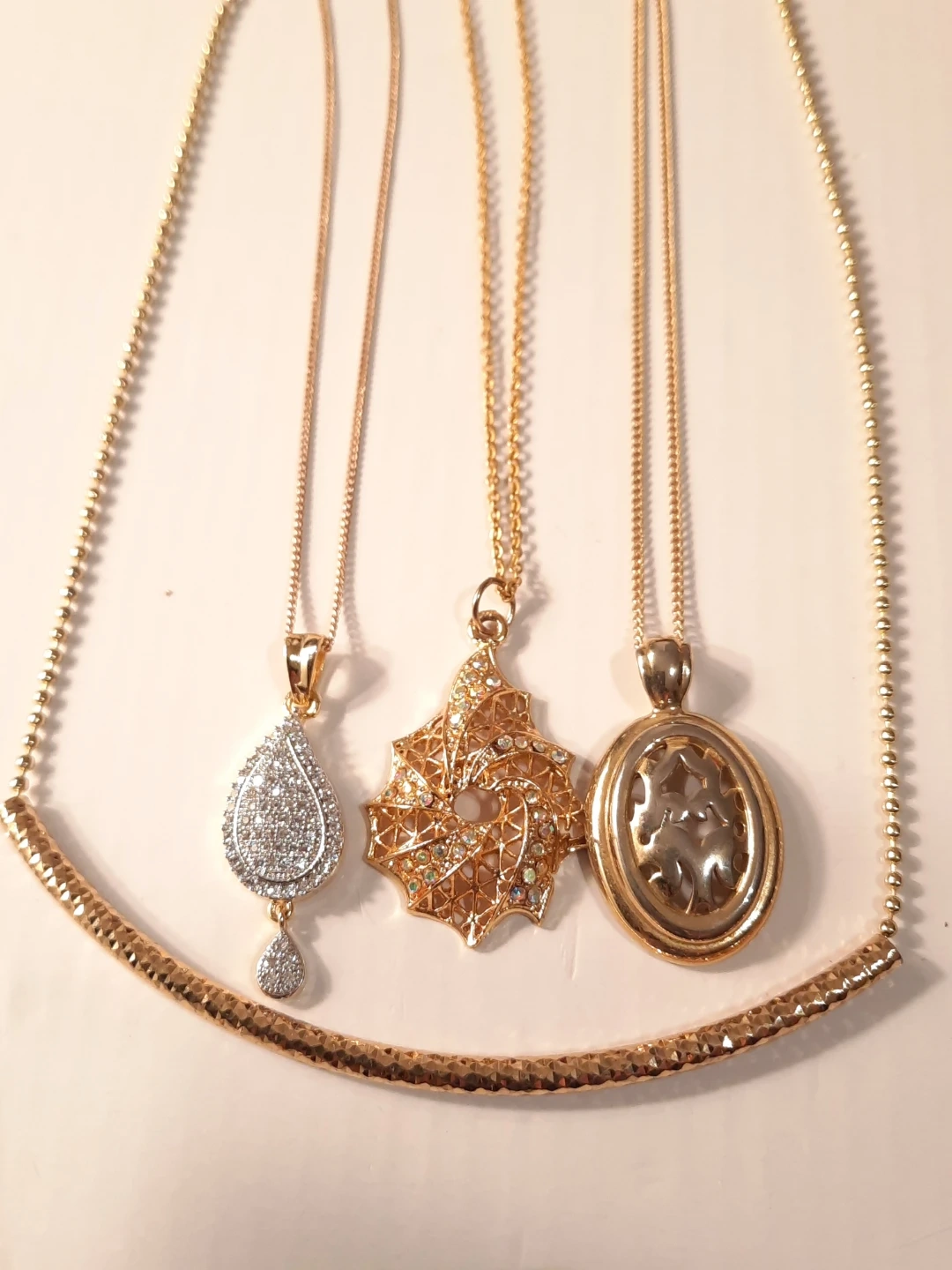 A collection of gold-tone necklaces, each with a unique pendant. One pendant is a teardrop shape covered in clear stones, another has an intricate starburst design with small stones, and the third is an oval pendant with an embossed pattern,and one tubular around the neck.. They're perfect for adding a bit of sparkle to any outfit!not new,but great condition