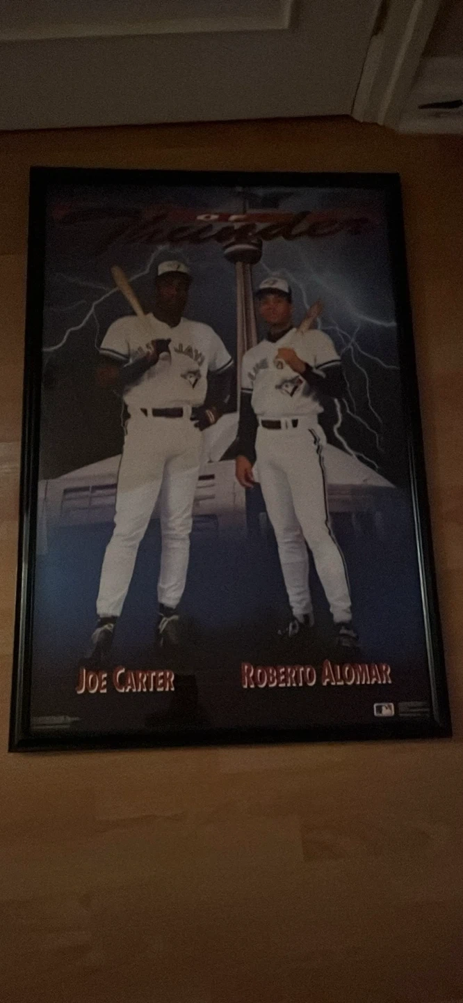 Framed poster featuring Joe Carter and Roberto Alomar in their Toronto Blue Jays uniforms. The poster includes the CN Tower and lightning effects. Perfect for any baseball fan!