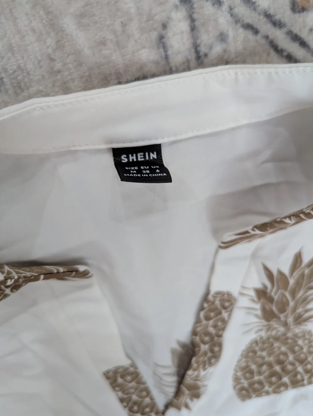Cute white blouse from SHEIN with a fun all-over pineapple print. It's a size medium (US 6) and made in China. This top is lightweight and perfect for warmer weather!