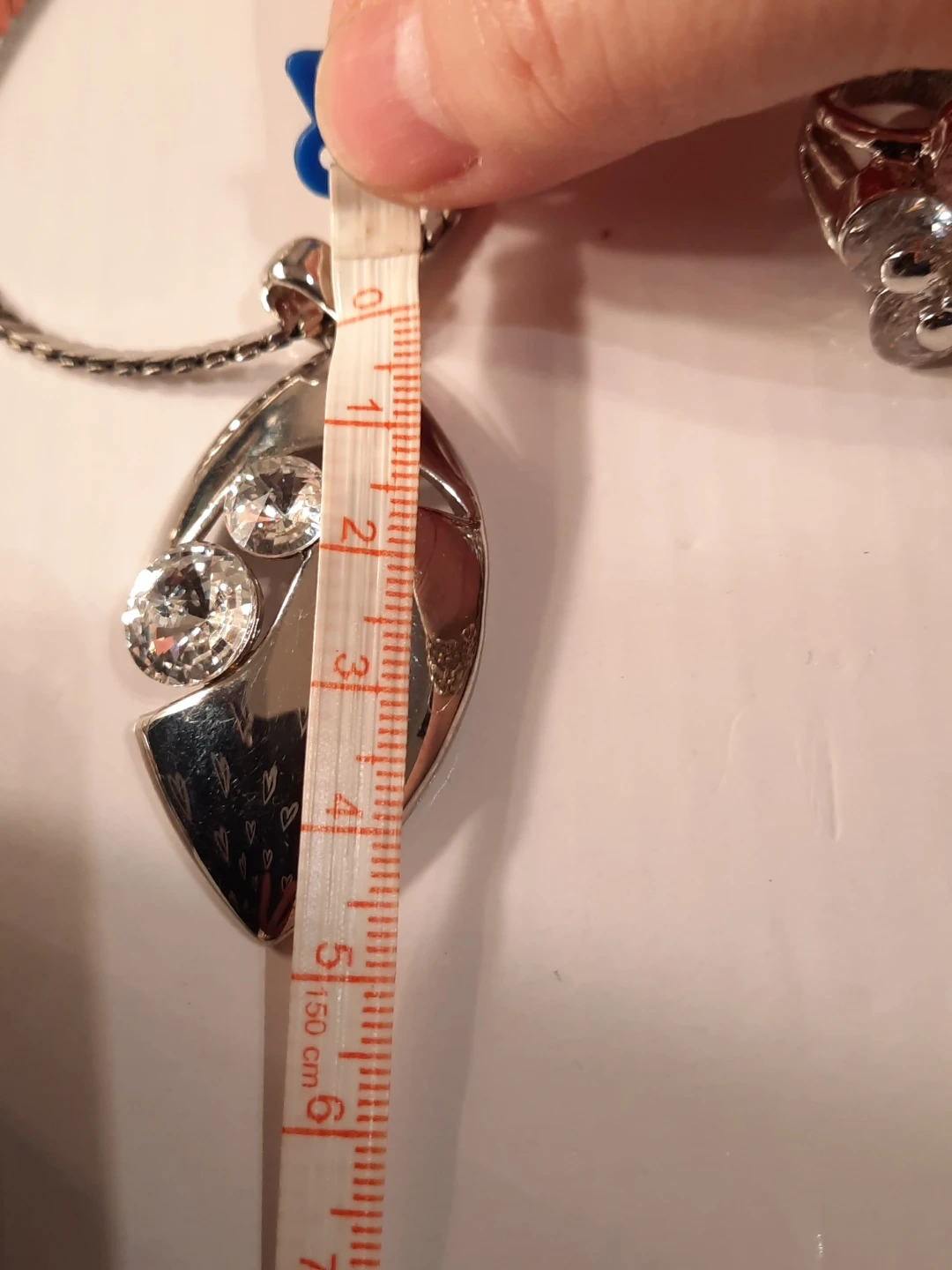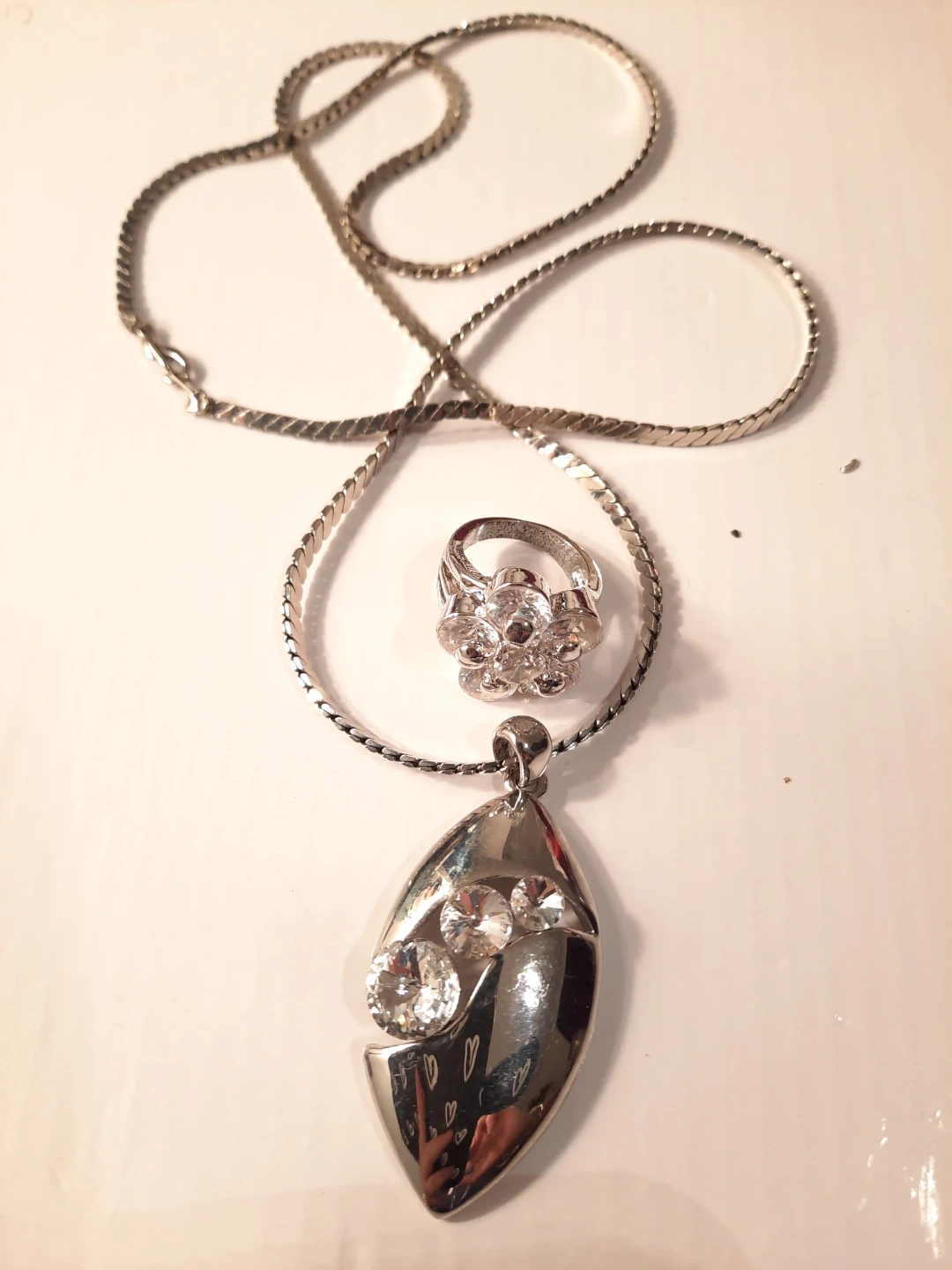 This set includes a silver-tone chain stainless steel necklace with a teardrop pendant adorned with clear stones, and a matching ring.18k gold plate stamped inside band outside look great the ring inside band show some minimal ware The pendant measures approximately 5cm long. The ring's band is about 7mm wide and it appears to fit a size 7 finger. It's a lovely combo for adding a bit of sparkle!