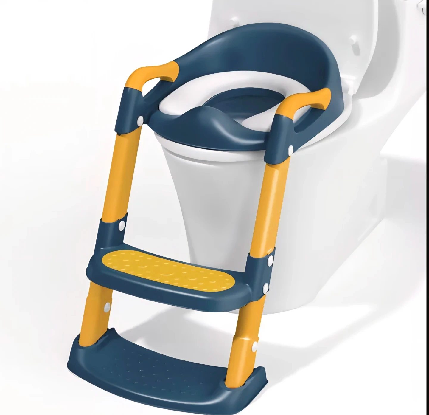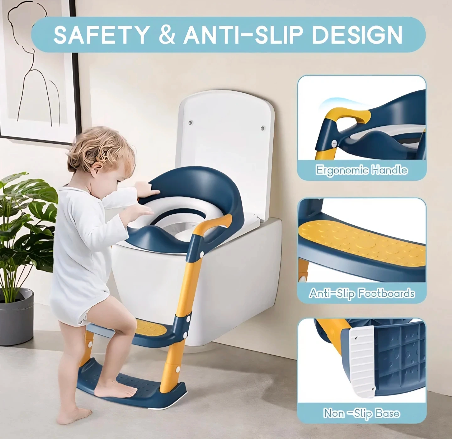 This toilet training seat helps little ones transition to using the adult toilet. It features an ergonomic handle for stability and anti-slip footboards for added safety. The non-slip base ensures it stays securely in place.