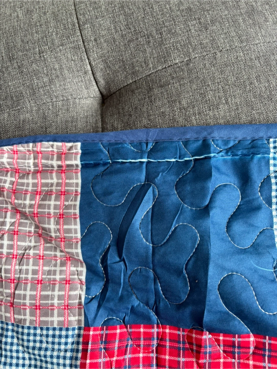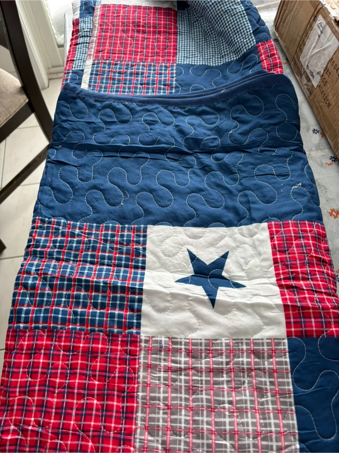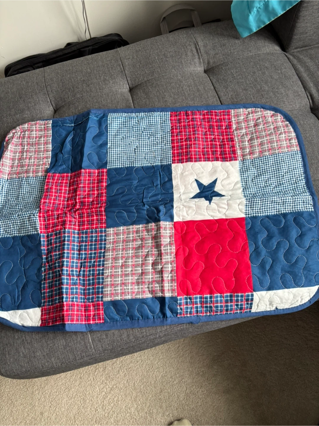 Classic red, blue, and white patchwork design.