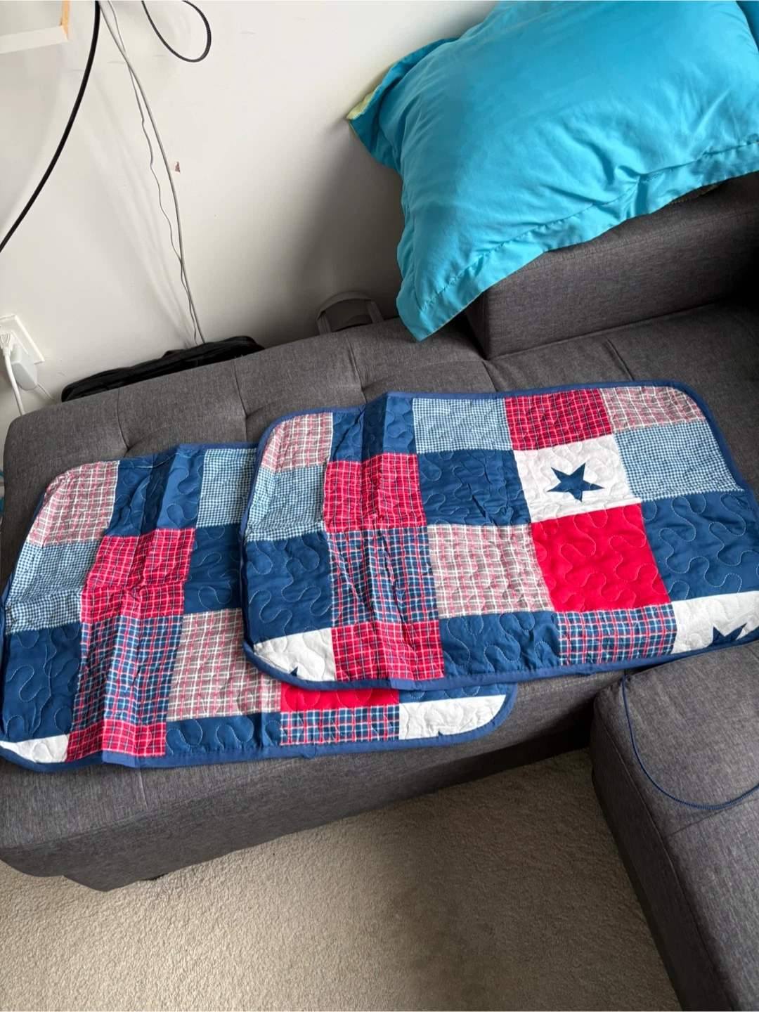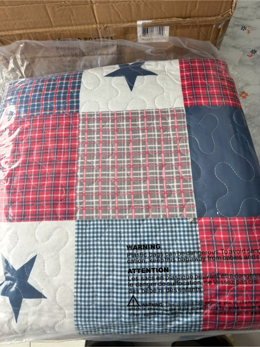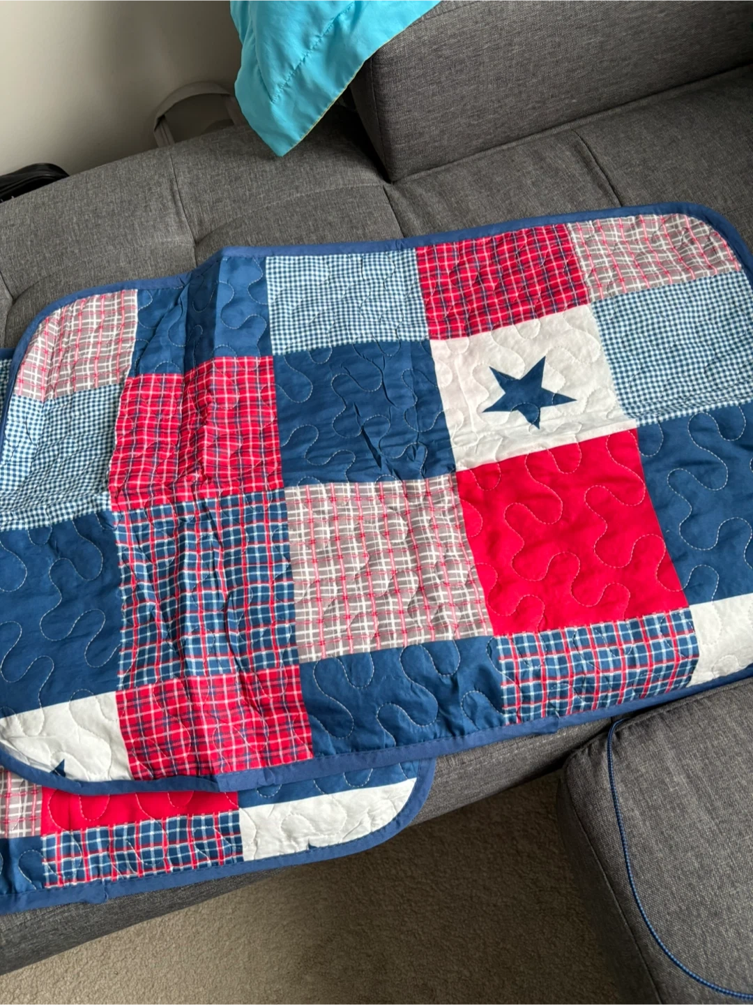 Classic red, blue, and white patchwork design.