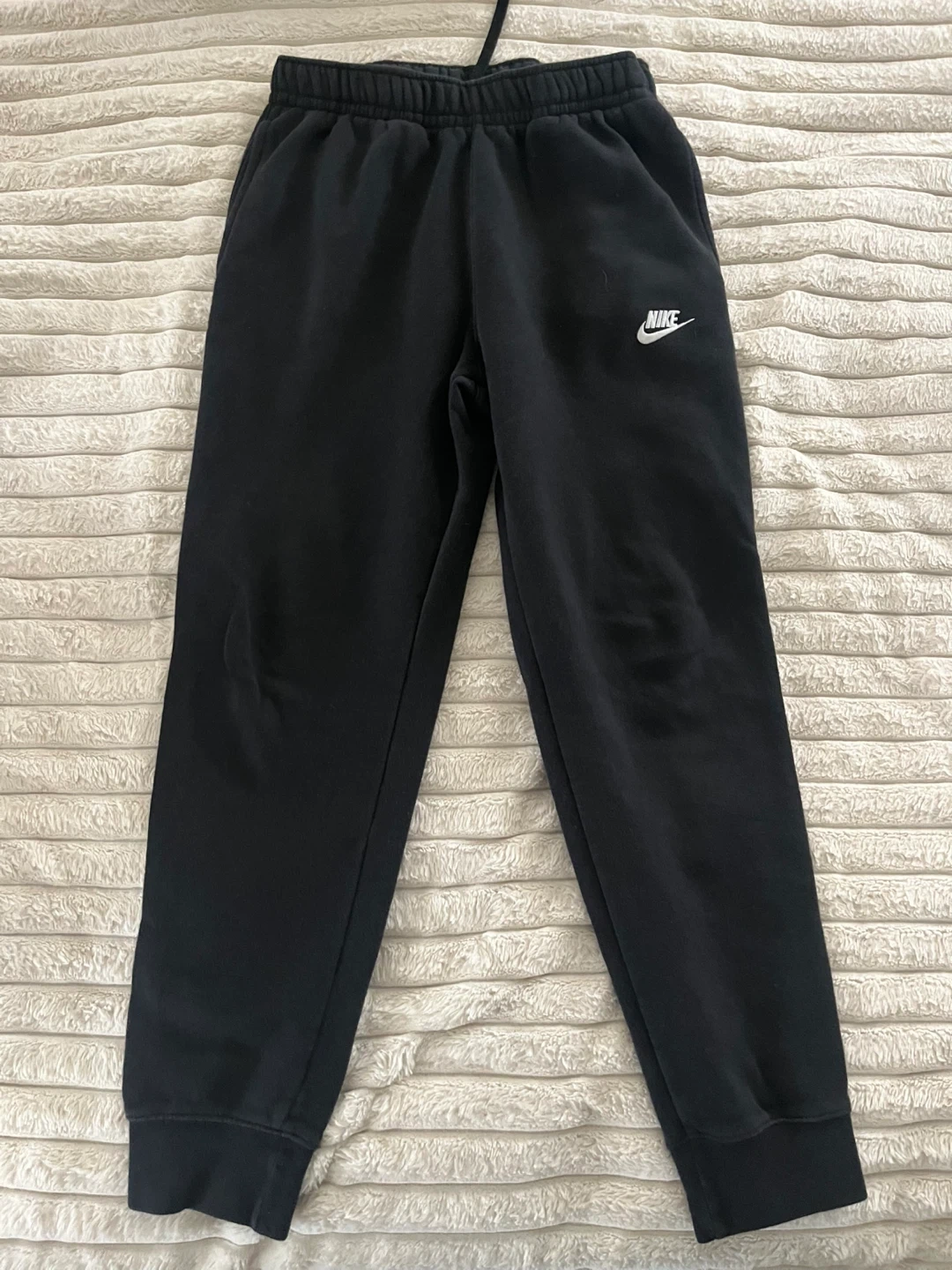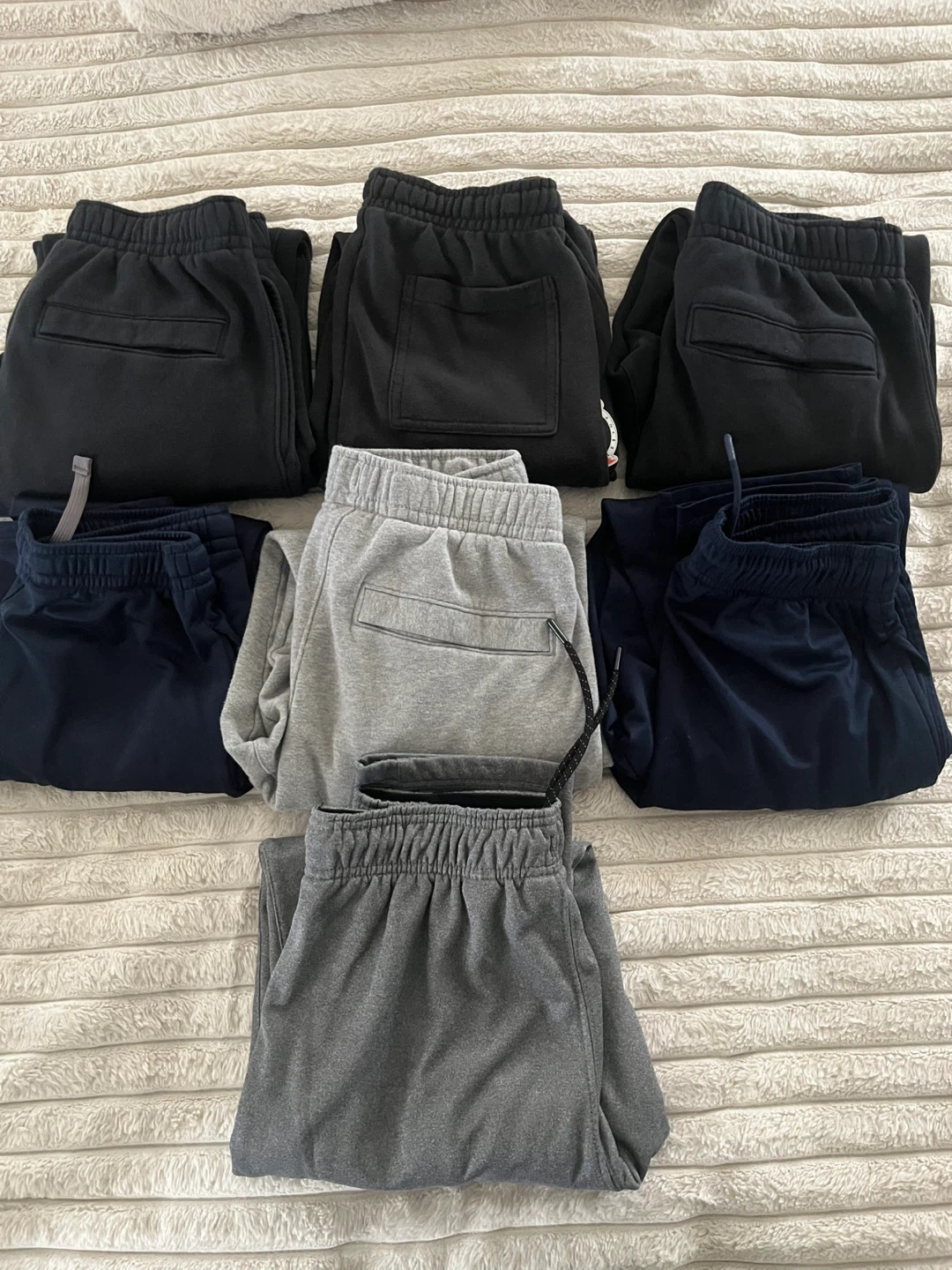 Bundle includes Nike and Jordan brand youth athletic pants. Features elastic waistbands with drawstring closures and cuffed ankles. Available in black, navy, and grey colours. Size youth XL or adult small.