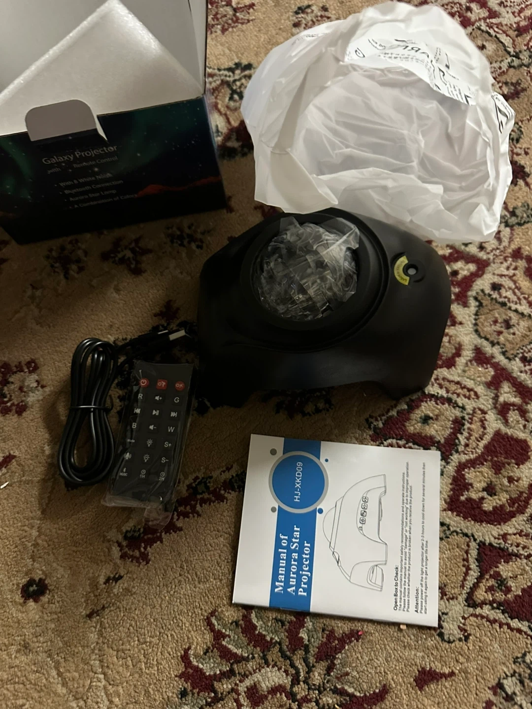 This music aurora projector lamp displays a galaxy with a remote control. It includes 8 white noises and Bluetooth connection. The material is ABS+PC. Great for creating ambience at home!