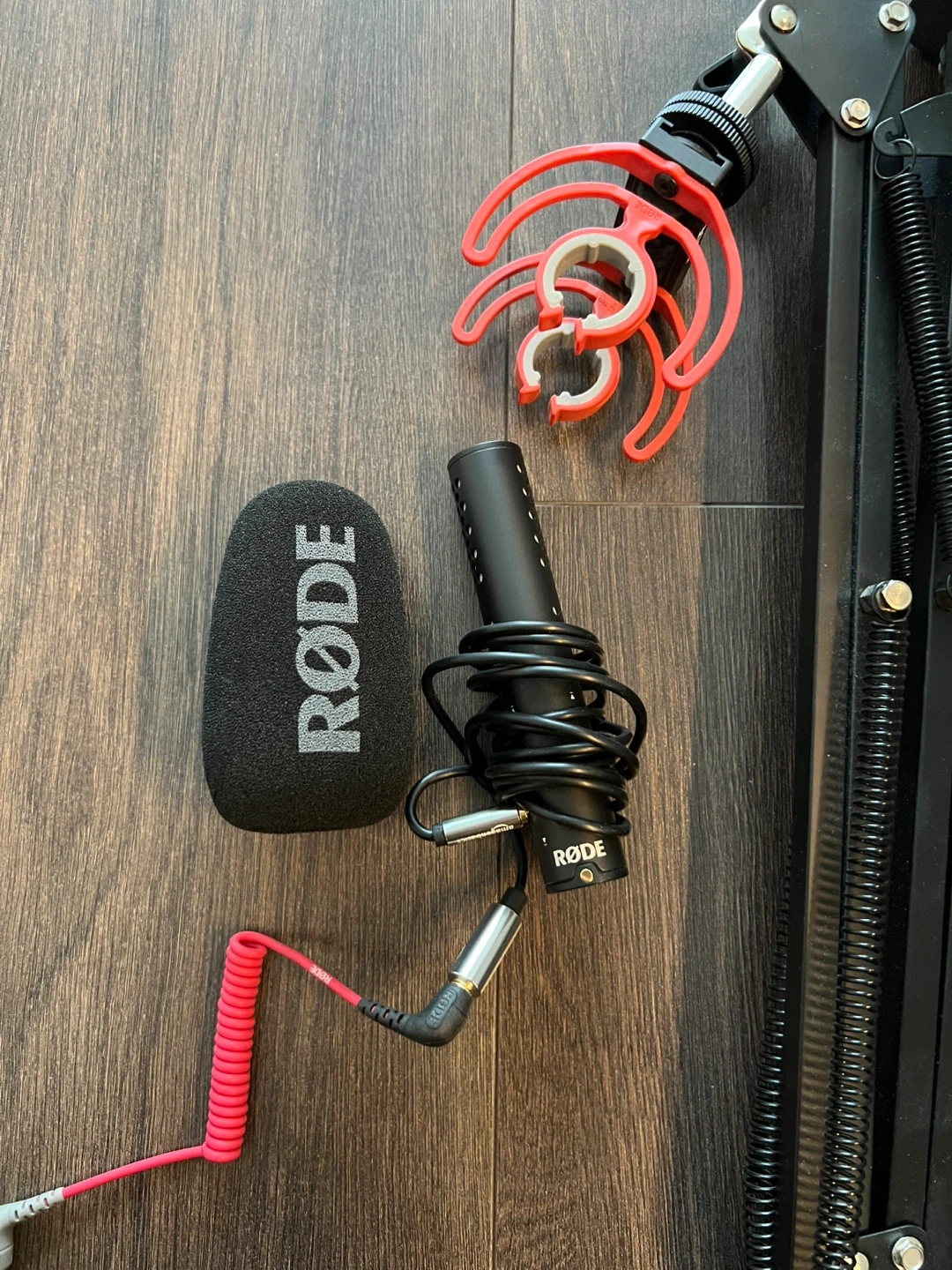 This is a RØDE VideoMic GO shotgun microphone. It's designed for DSLRs and camcorders. The kit includes a foam windscreen and shock mount. A Neewer adjustable boom arm stand is also included.