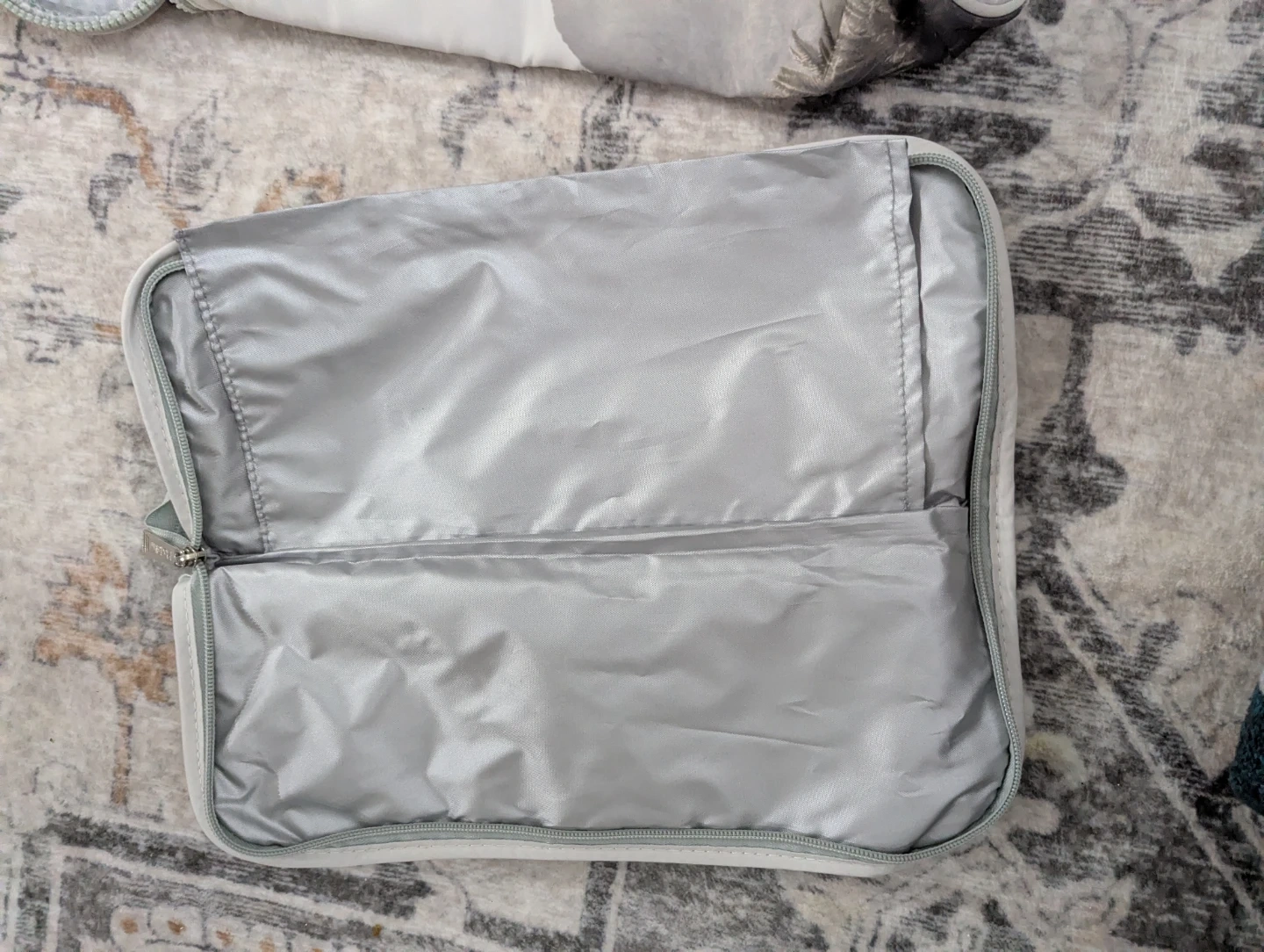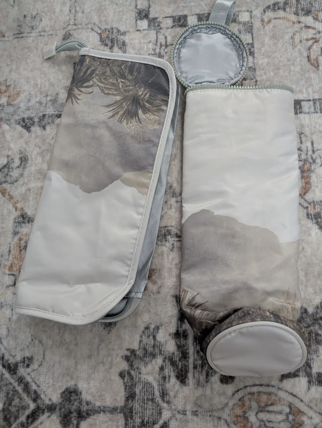 Two-piece travel organizer set with a grey landscape print. One pouch is a flat sleeve style, the other is a cylindrical bag with a zippered compartment at the top. Both have a zippered closure. Interior is lined with silver satin-like material.
