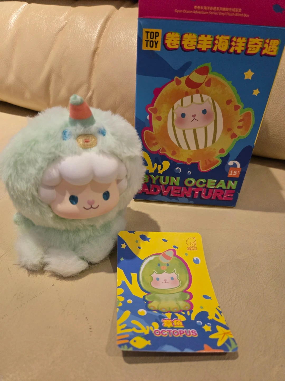This is a Gyun Ocean Adventure series vinyl plush opened blind box. It features a cute octopus character in a light green fuzzy costume with a unicorn horn. Includes collectible card.