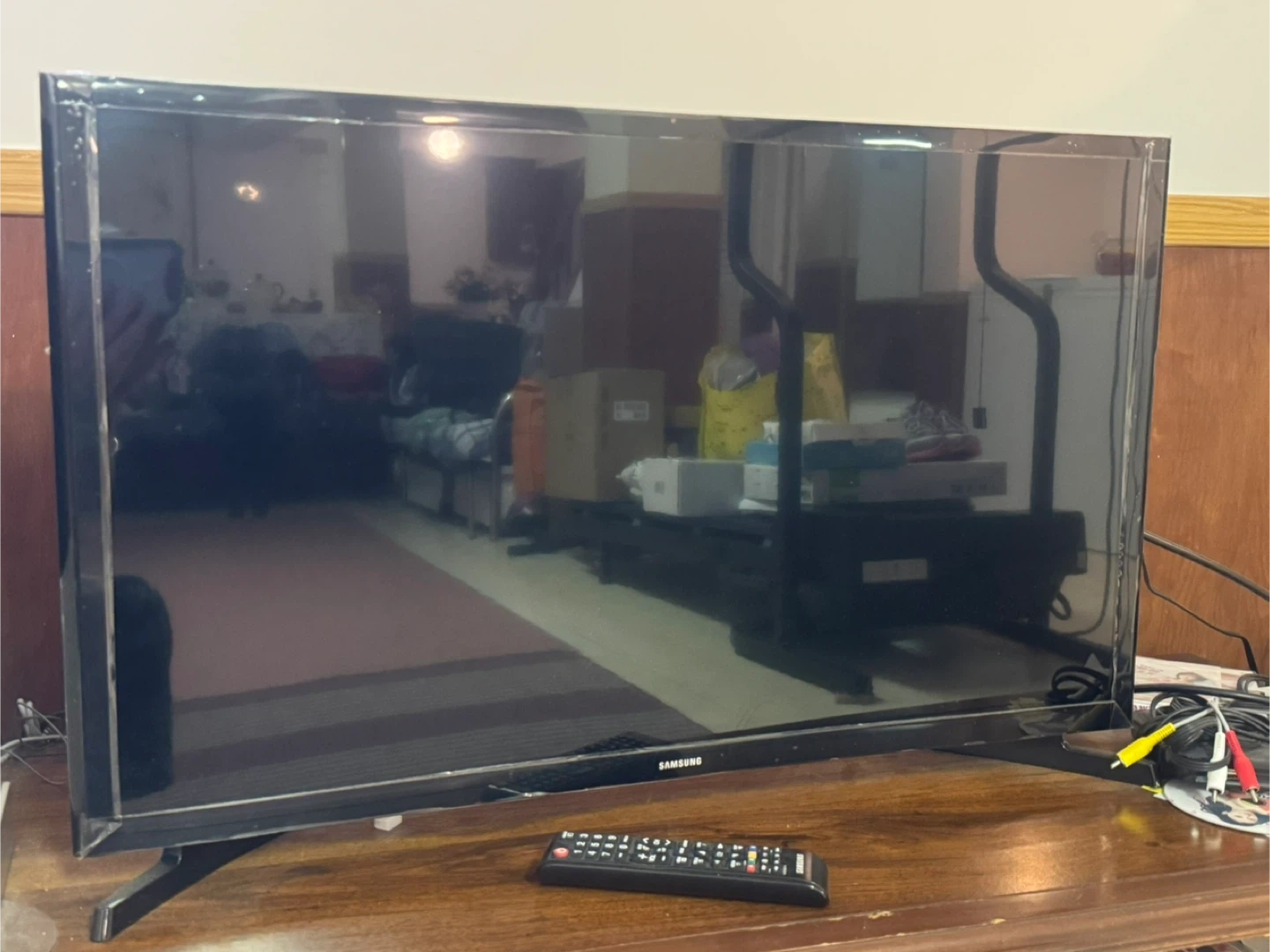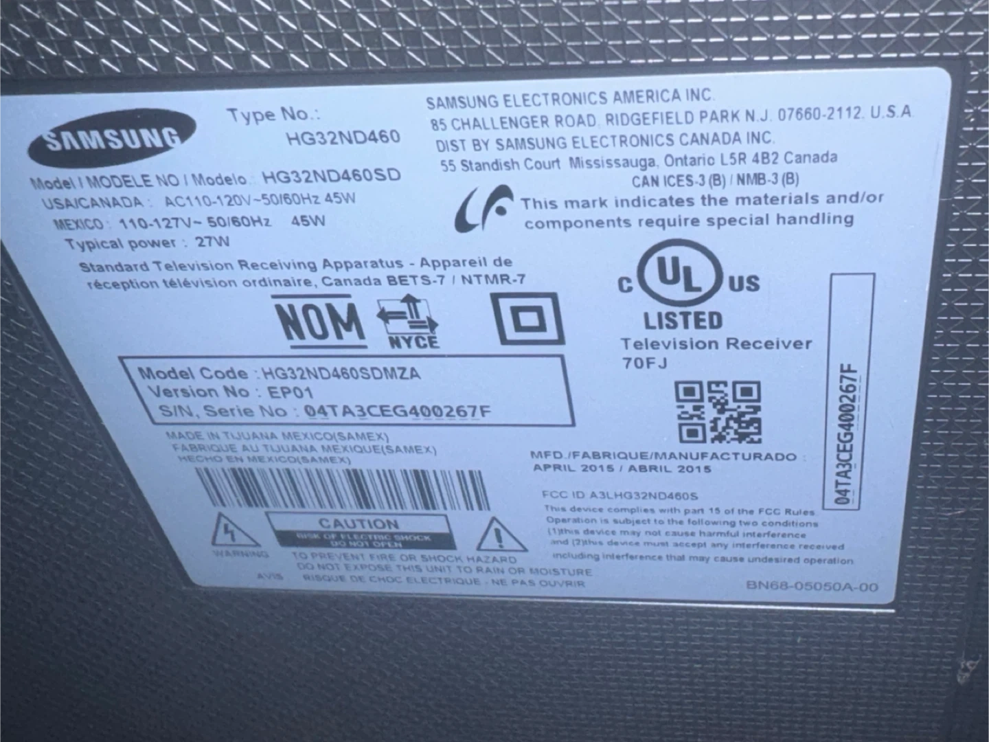 Samsung HG32ND460SD 32 inch HD television. Made in Tijuana, Mexico. Includes remote and cables.
