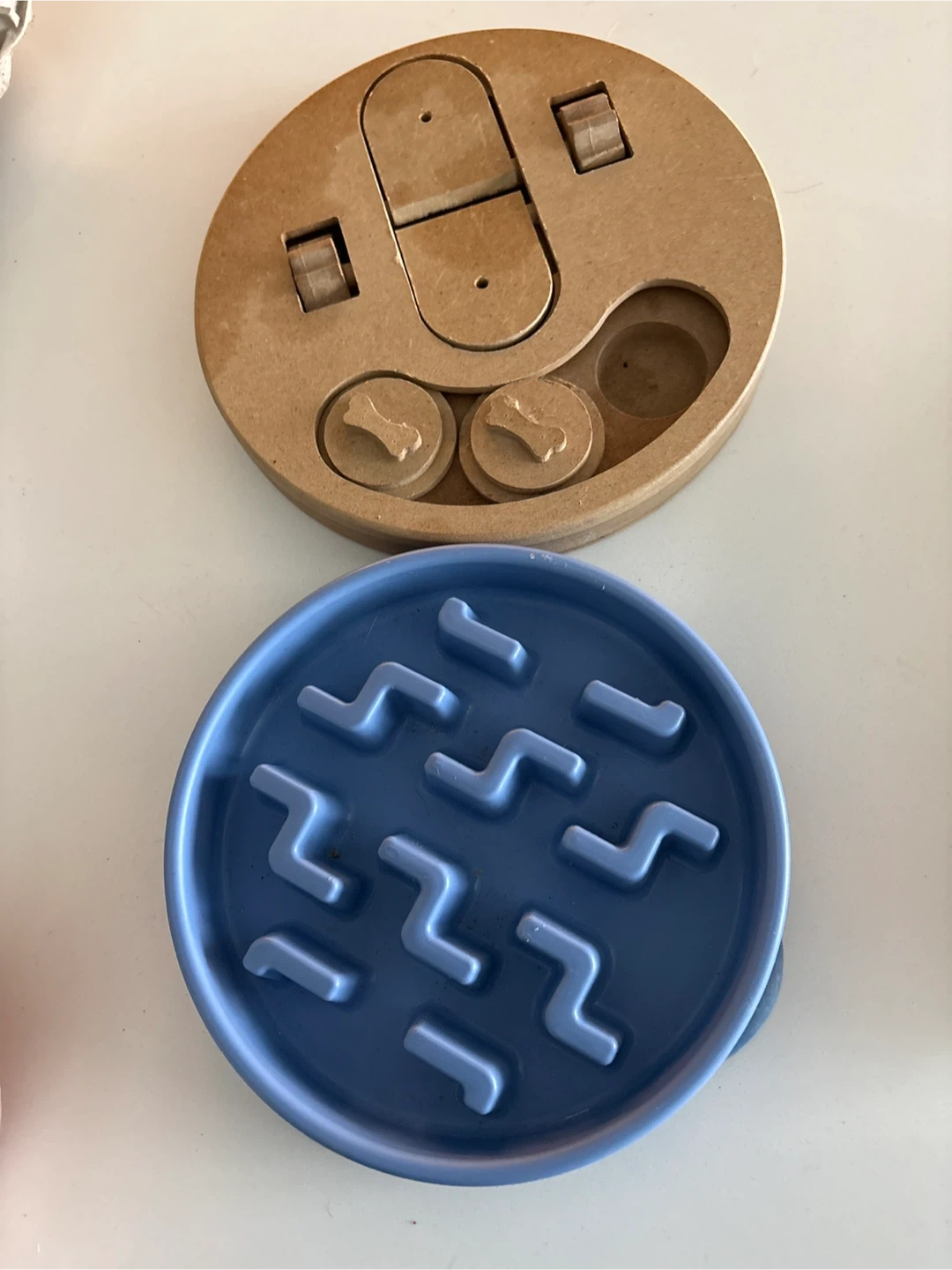 This set includes a wooden puzzle feeder with sliding covers and a blue slow feeder bowl with a zig-zag design. It's great for mental stimulation and managing your dog's eating pace. Dishwasher safe slow feeder bowl.