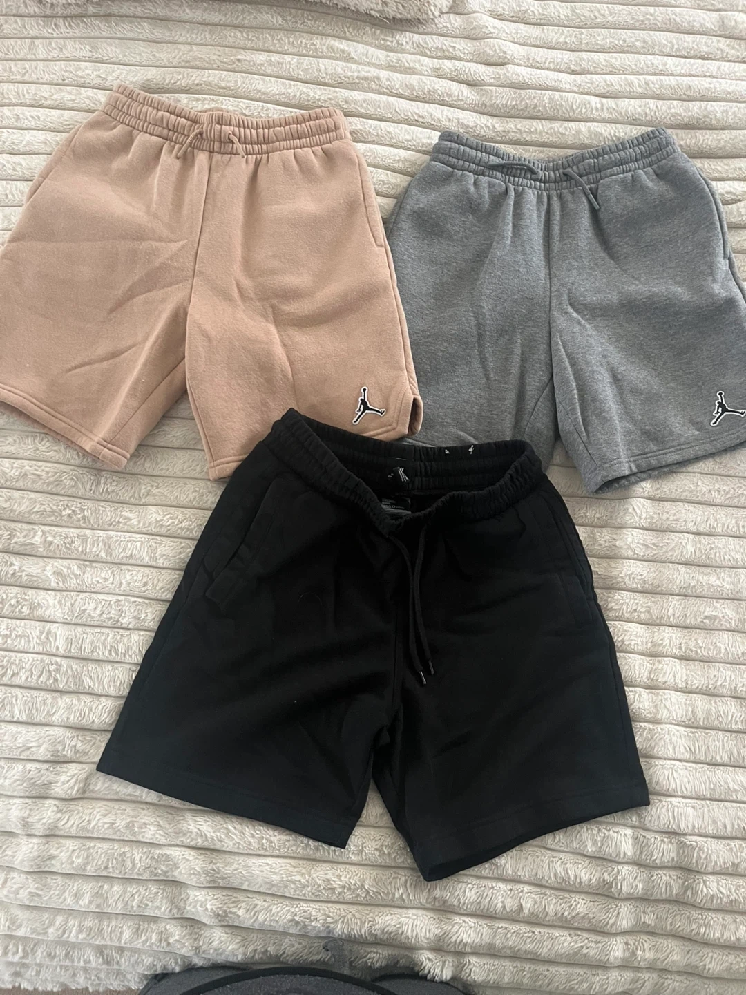 Two pairs of Jordan sweat shorts in grey, and tan and H&M shorts in black. Elastic waistband with drawstrings. Made of soft, comfortable material.