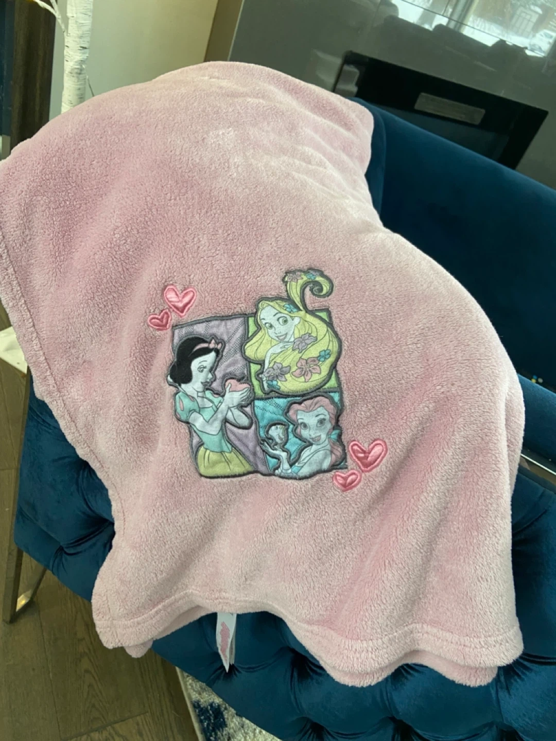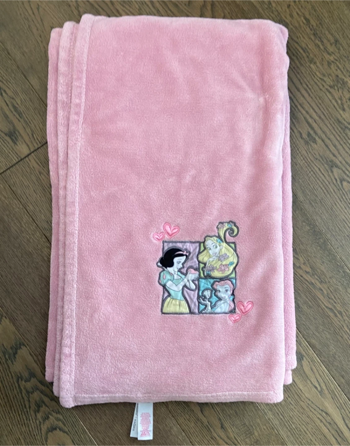 Soft pink Disney Princess fleece throw blanket featuring Snow White, Rapunzel, and Cinderella