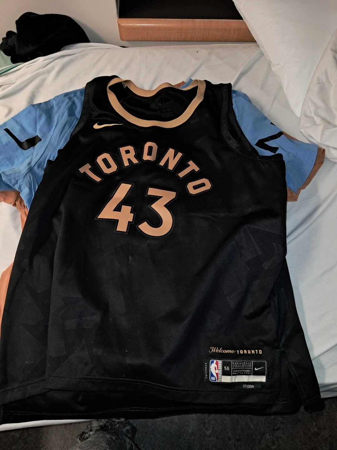 Nike Swingman jersey for the Toronto Raptors. Features 'Toronto' and number '43' on the front. Size 56, engineered for basketball. It's a black and gold colourway.