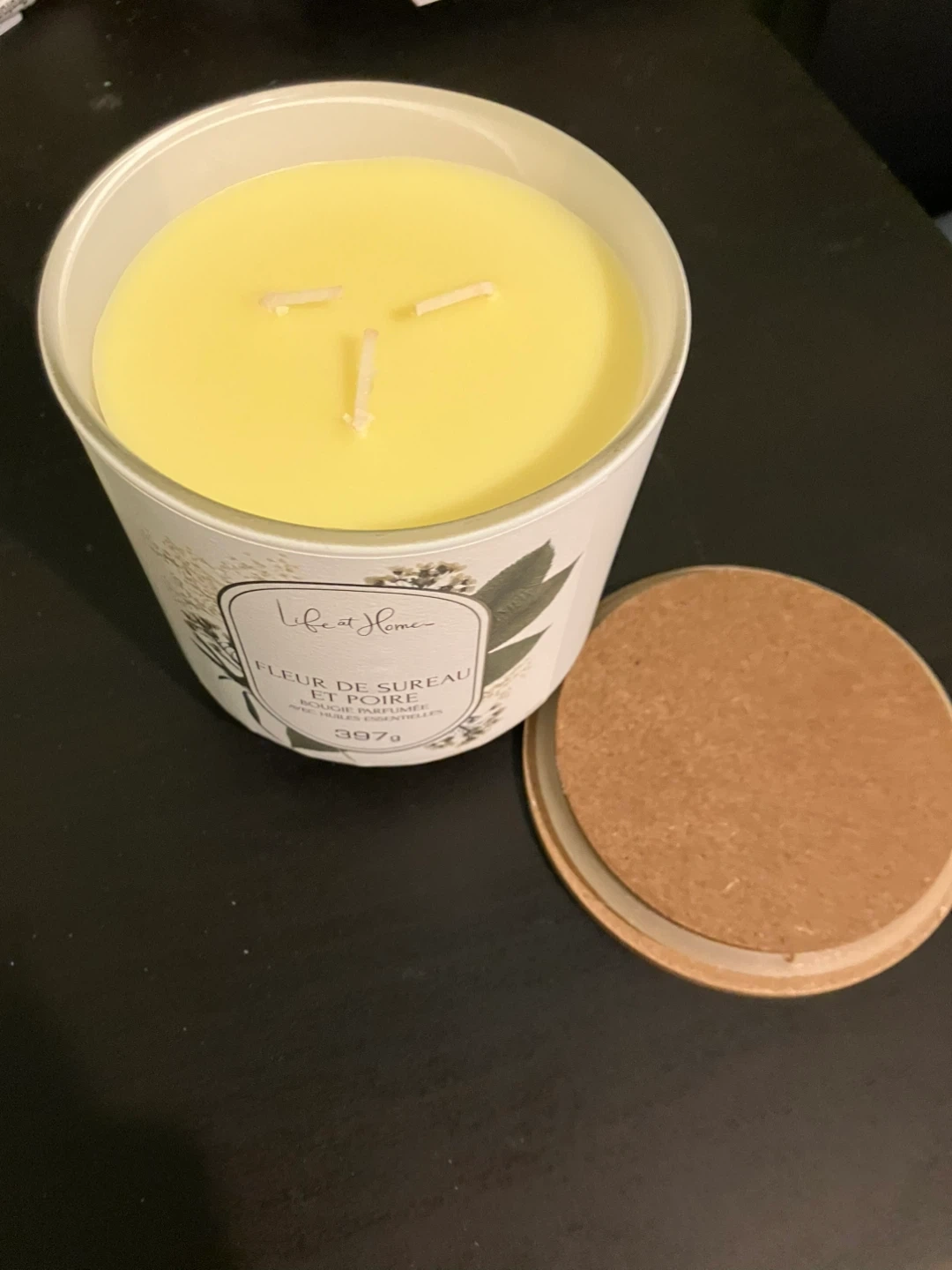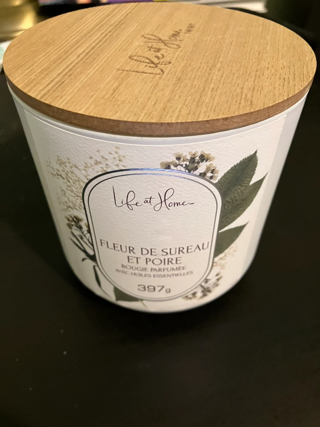 This Life at Home scented candle is "Fleur de Sureau et Poire" (Elderflower and Pear) scented. It's a 397g candle made with essential oils. This would be nice for setting a relaxing mood at home.