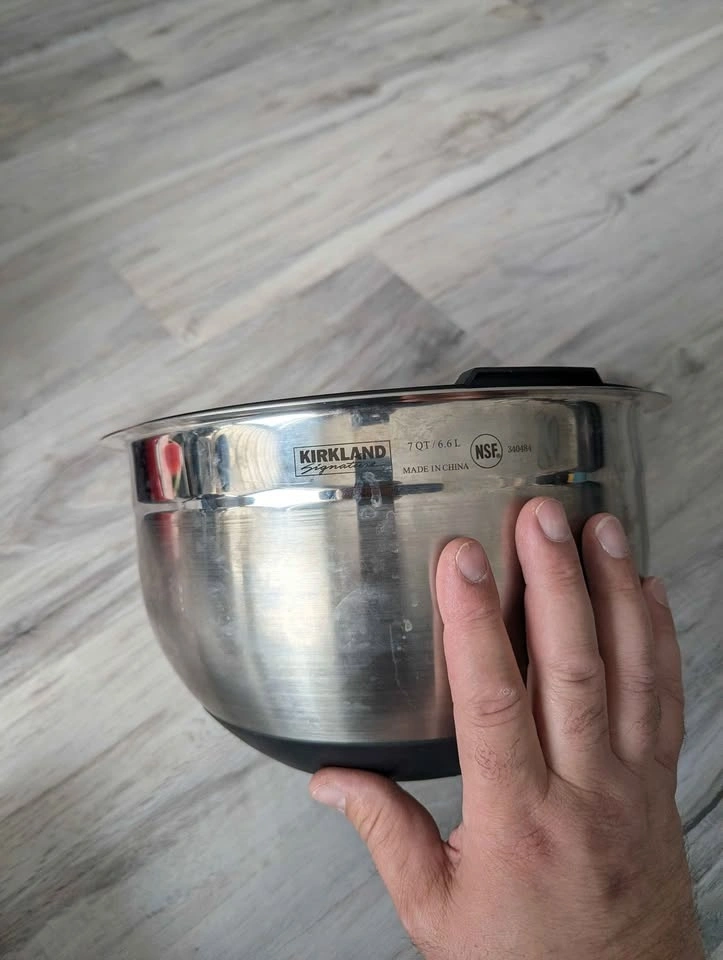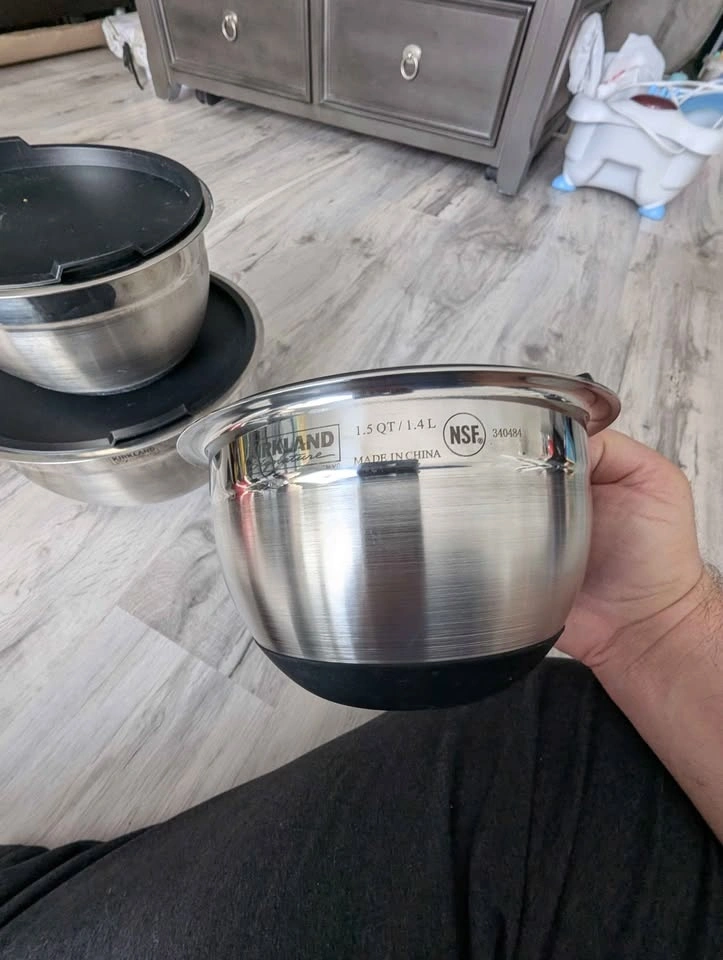 Set of 3 stainless steel bowls with tight-fitting BPA-free lids. Sizes include 7qt, 3qt, and 1.5qt. Features etched measurements and non-slip silicone bases. Bowls are dishwasher safe. Pickup in Kitchener, Forest Heights.