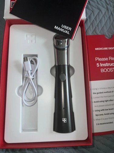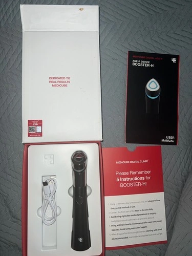 This is a sleek black Medicube AGE-R BOOSTER-H Booster Healer device, made in Korea, designed for anti-aging and improving skin health using LED technology. It's a convenient and effective solution for radiant-looking skin. NEW OPEN BOX, NEVER BEEN USED. Tested to see if it charges, and it does.