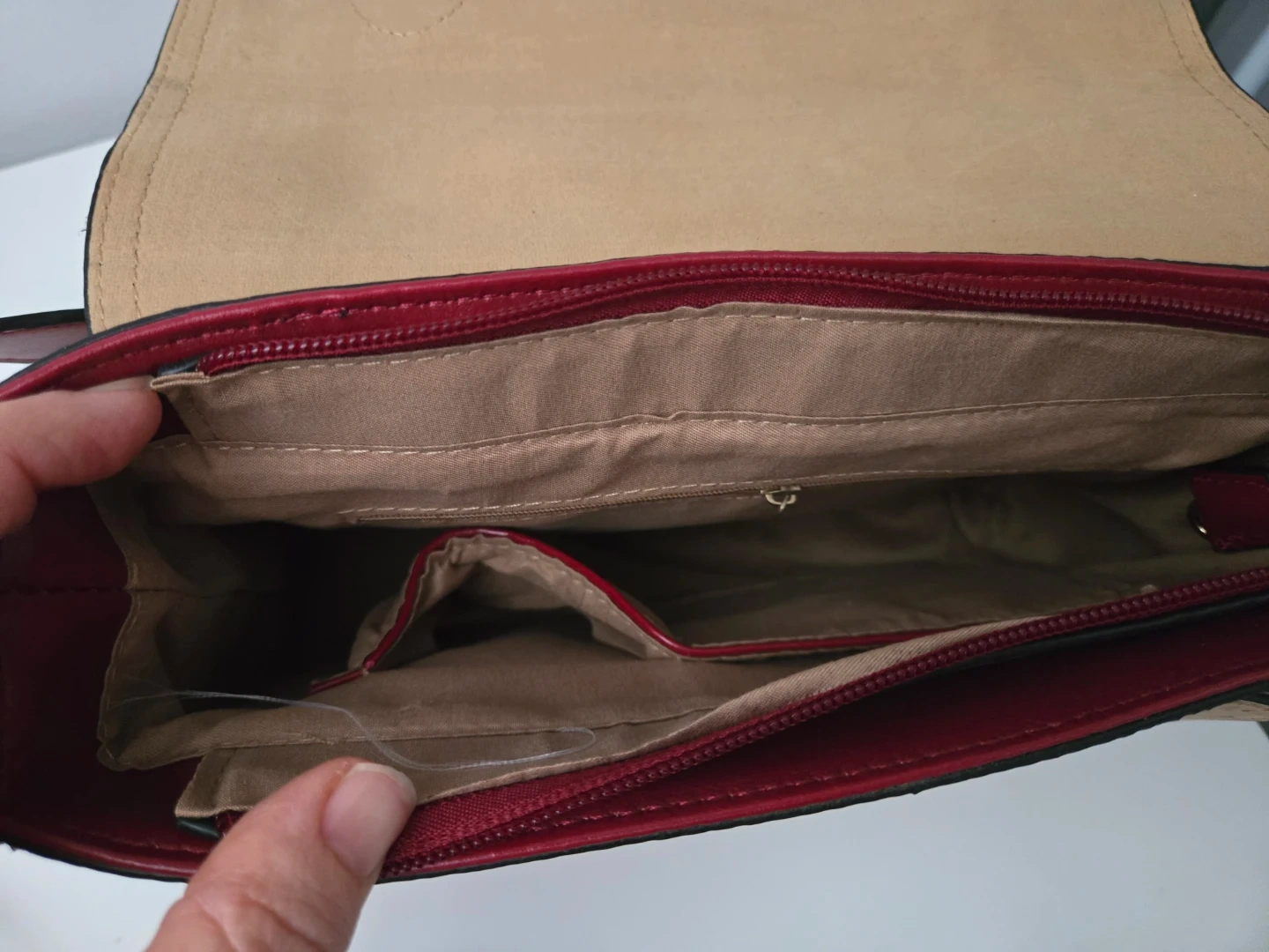 This satchel bag features a unique cork exterior from Portugal. It has a faux leather trim and strap in a deep red. The interior has multiple compartments, including a zippered pocket.