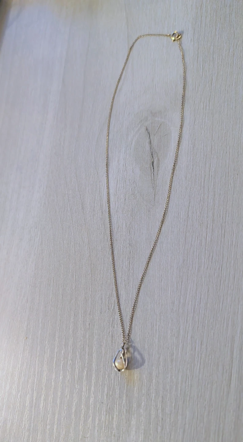 A delicate silver tone necklace featuring a pendant with a small pearl accent. It's simple and elegant, perfect for everyday wear or dressing up an outfit. This piece would make a nice gift for someone special.