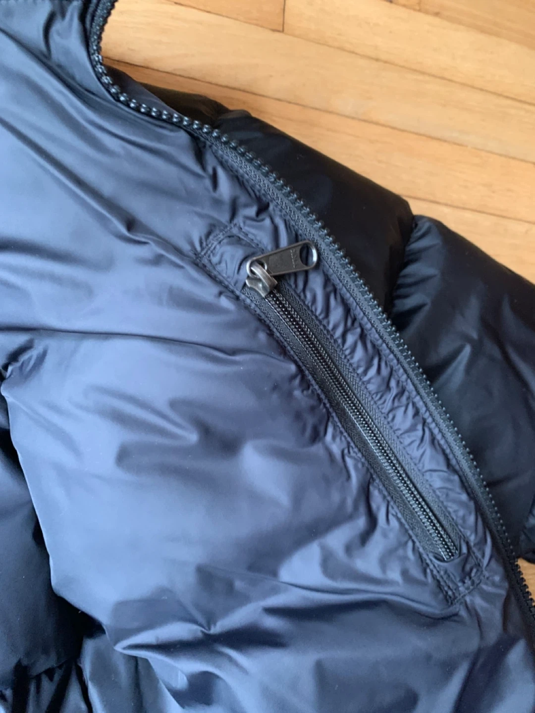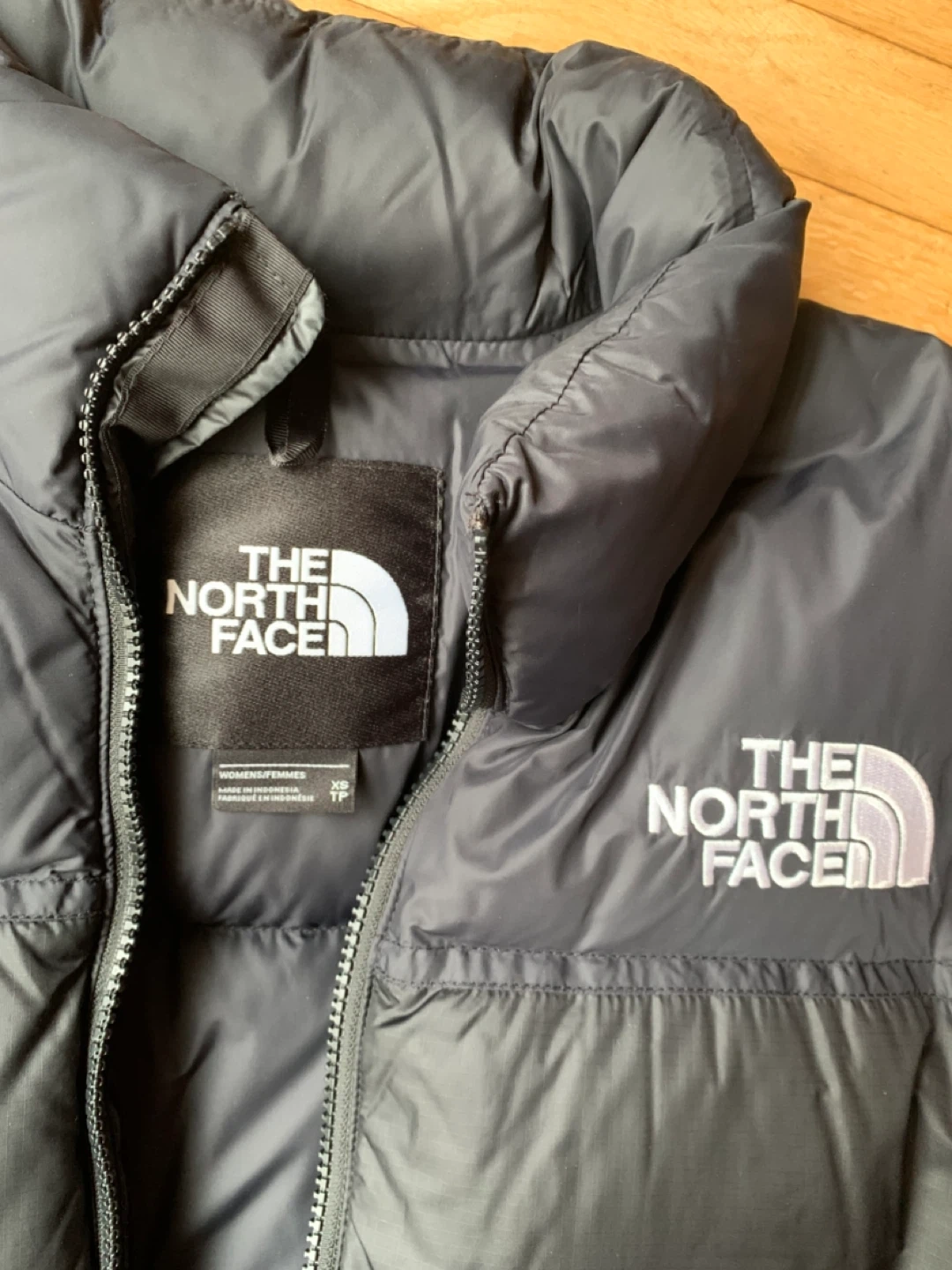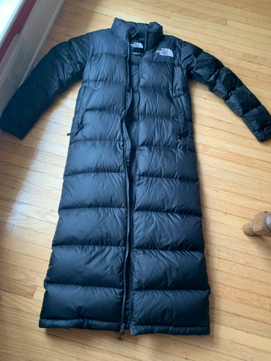 This is a black puffer maxi coat from The North Face. It's made for women and is a size XS. It features a full zip closure and zipped pockets. This coat is great for keeping warm during colder weather!