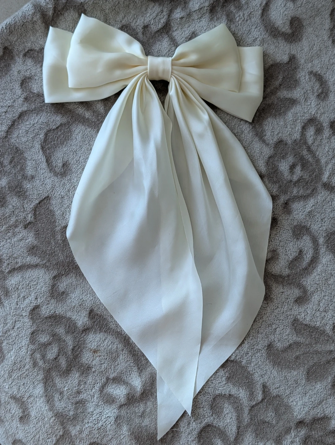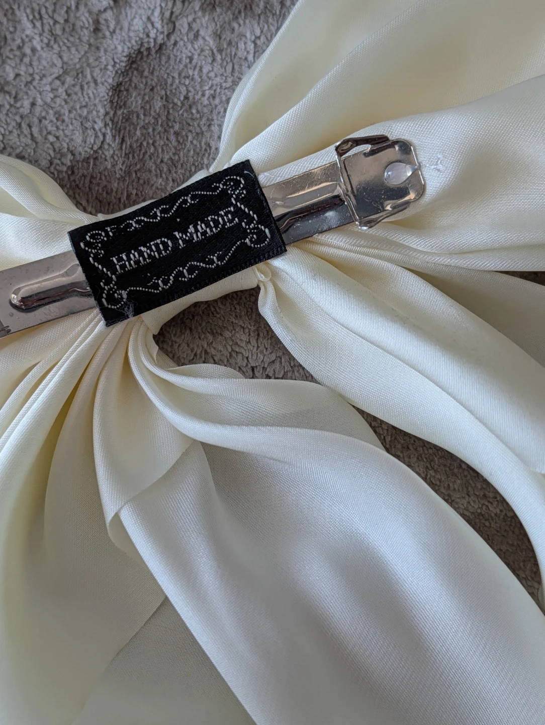 Oversized cream bow hair clip with a satin finish. It's handmade and features a secure metal clip. This statement accessory adds a touch of elegance to any hairstyle!