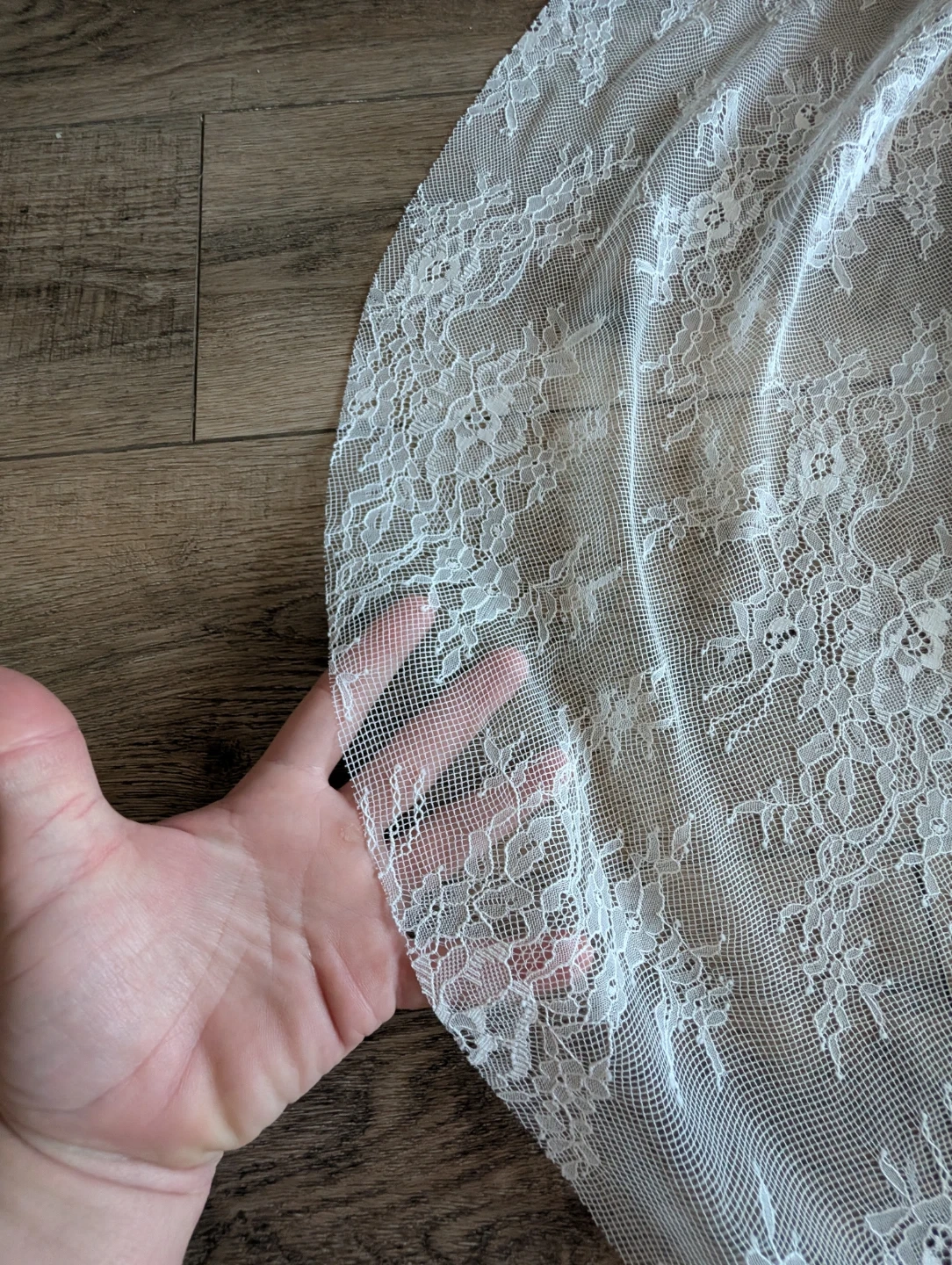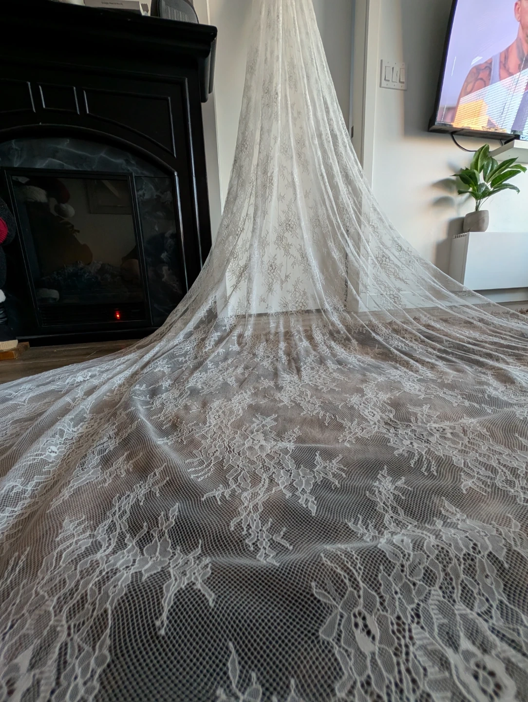This is a beautiful soft white lace wedding veil.