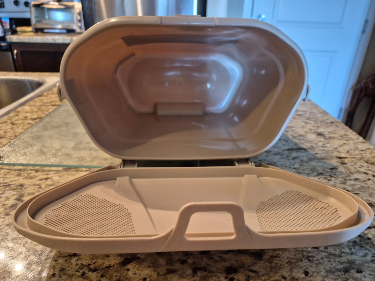 This green bin is designed for kitchen use. It comes with a lid. This bin is perfect for collecting food scraps. Item has no handle. User should add on by string or a rope.