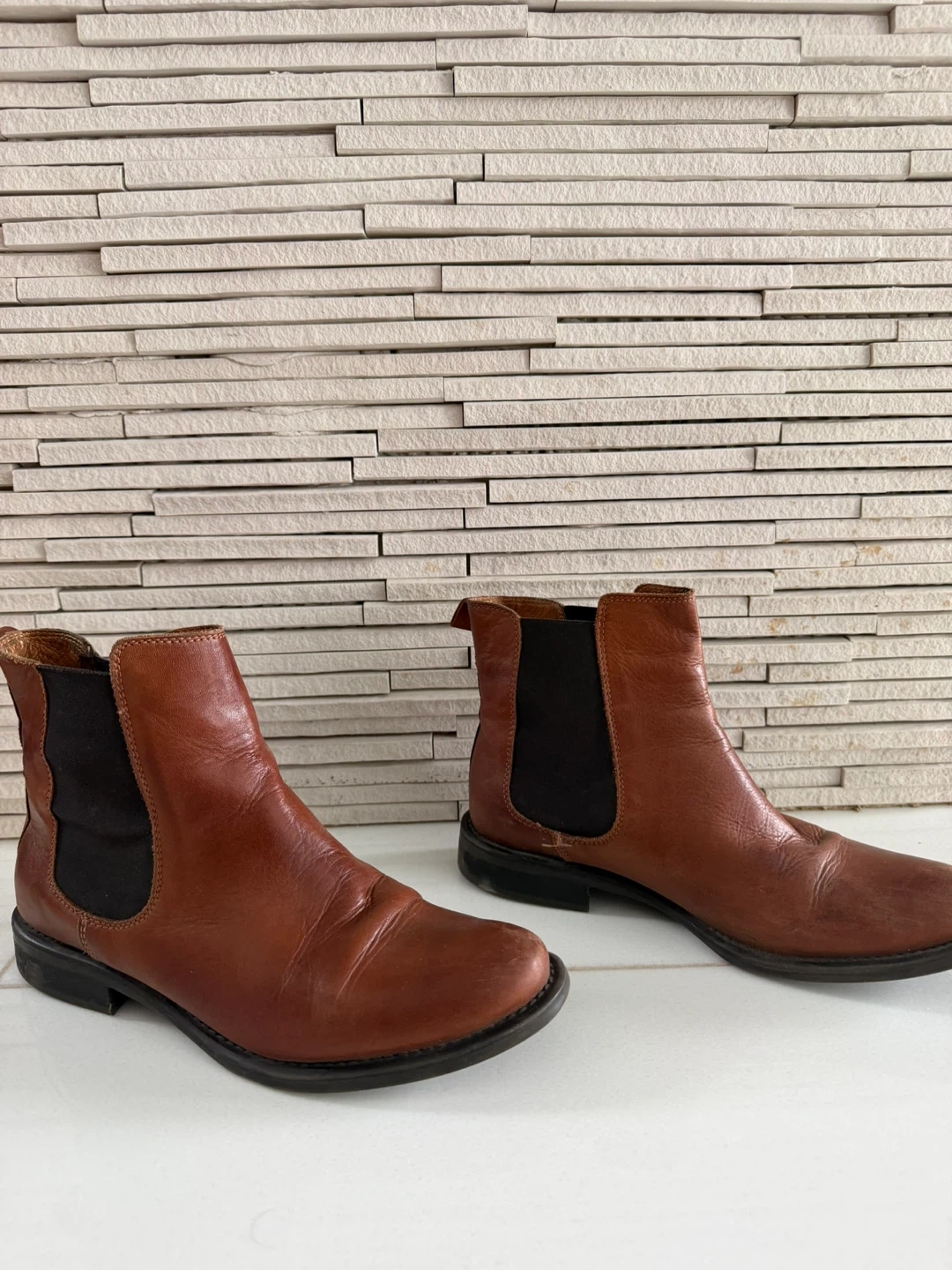 These are a pair of brown leather Chelsea boots. They feature elastic side panels for easy on and off. Size is 40.