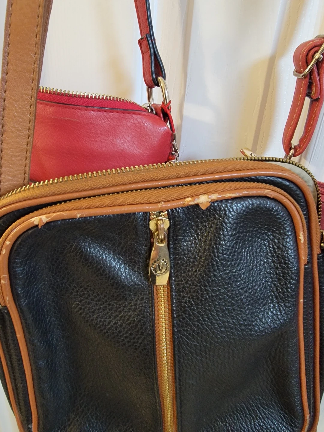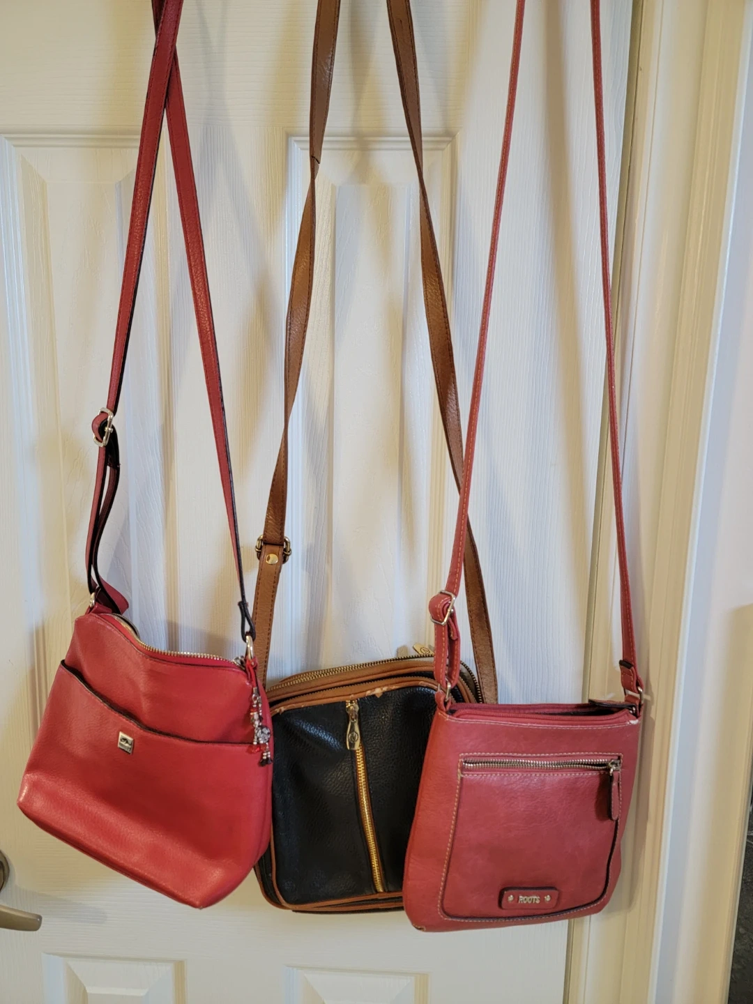 Three purses for sale: two red crossbody bags and one black and brown shoulder bag. They all have zippers and straps. Great for everyday use!