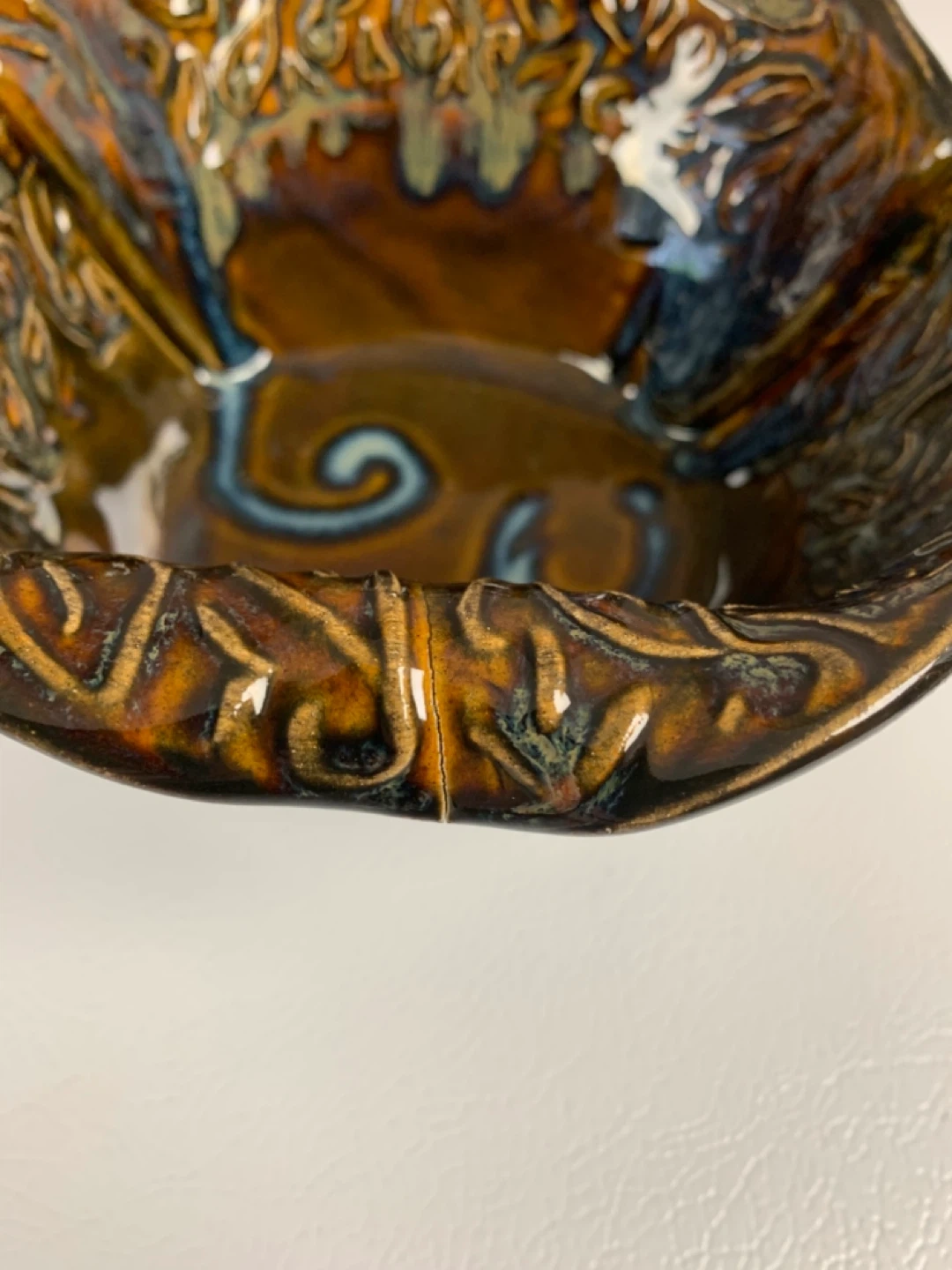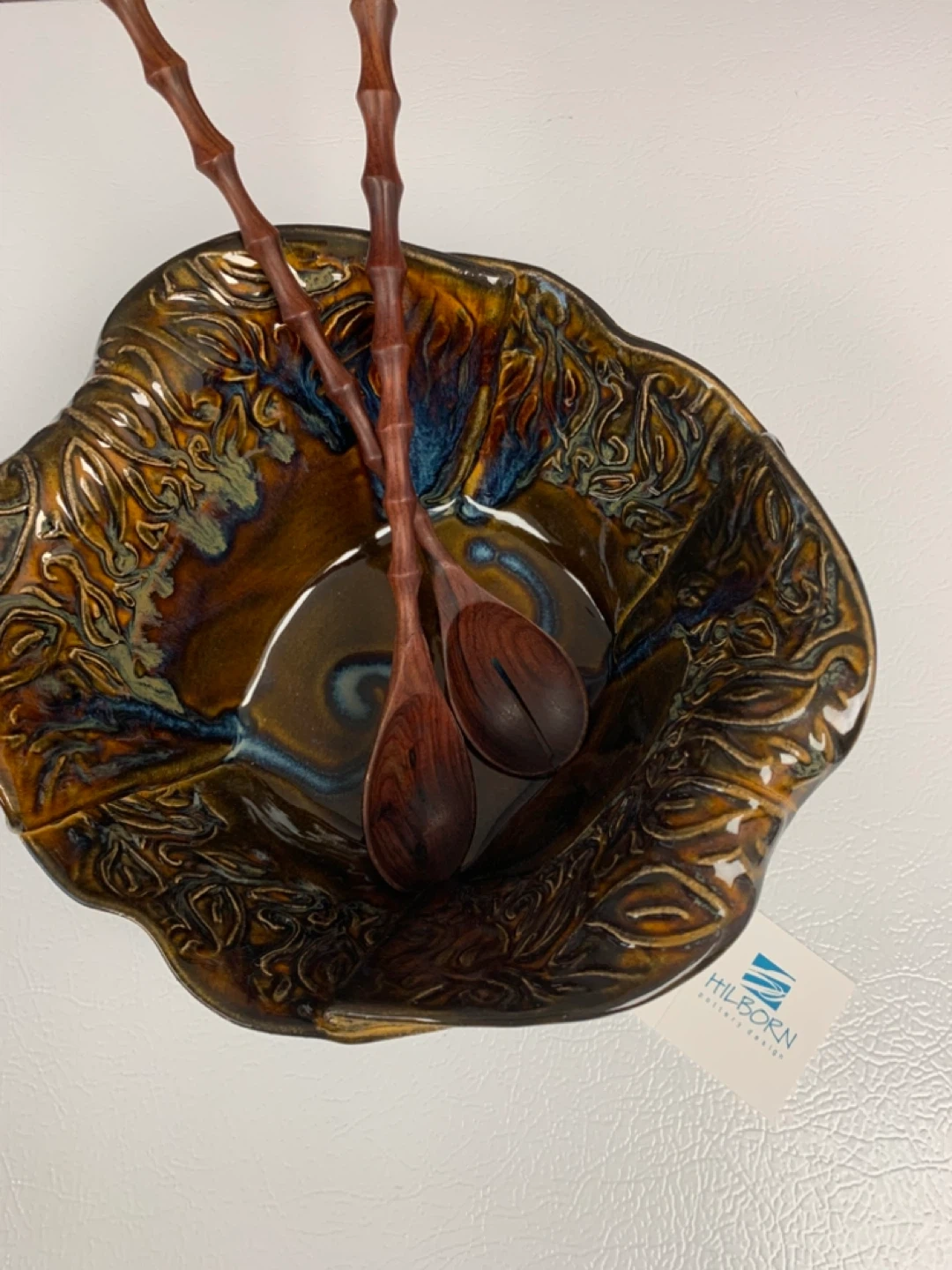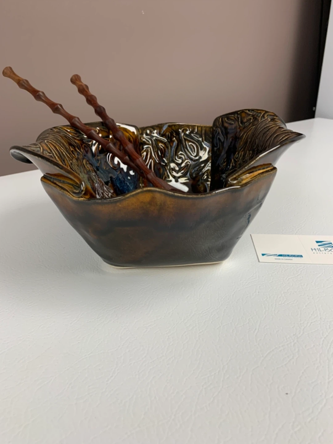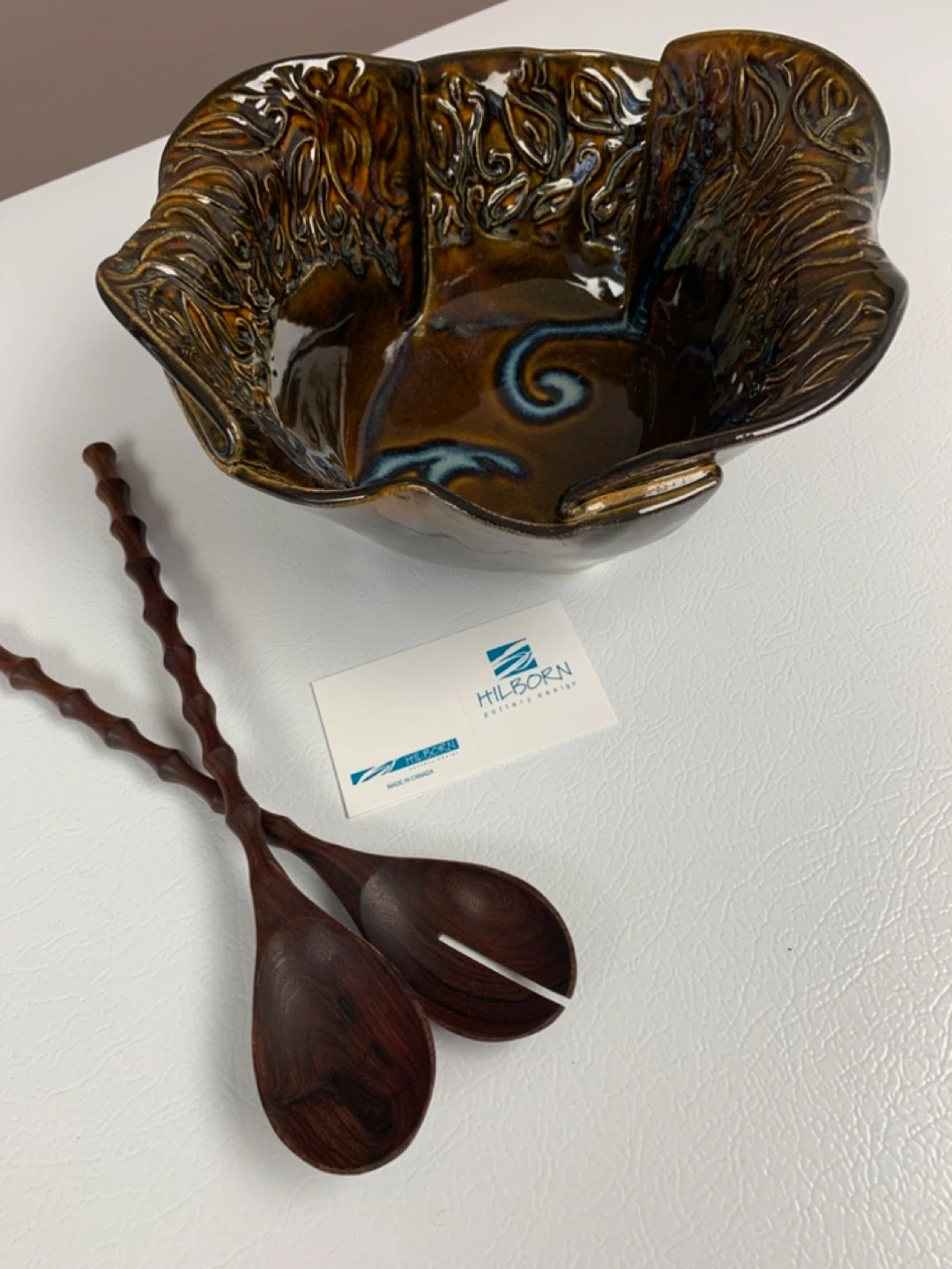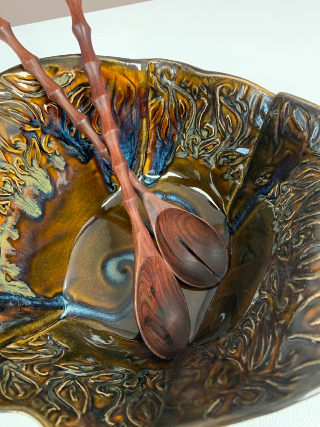 Beautiful handcrafted ceramic serving bowl with matching wooden salad servers. It features a unique, textured glaze in rich earthy tones. This piece is perfect for serving salads or other dishes at your next gathering!