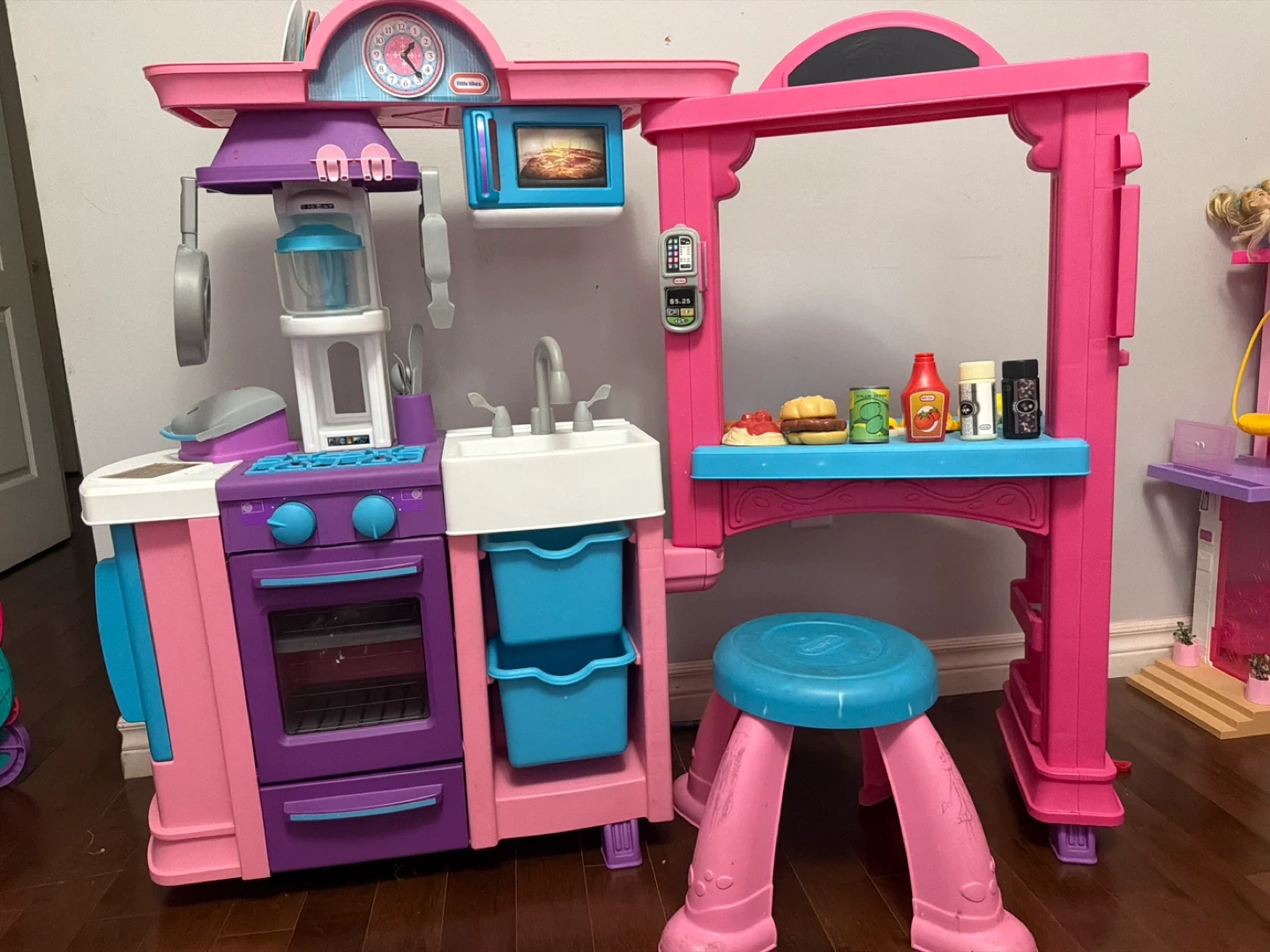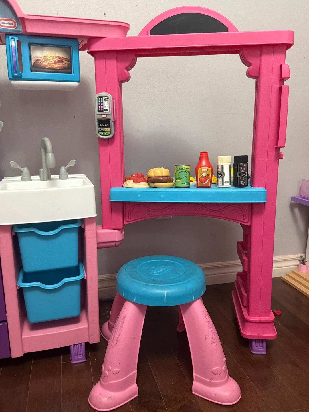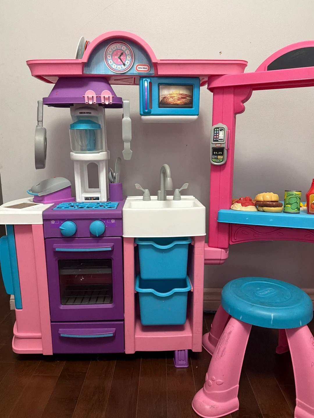 This is a pink and purple Little Tikes play kitchen for kids. It includes a sink, oven, microwave, and various play food accessories like a burger, ketchup, and drinks. It also comes with a blue stool for little chefs. It's perfect for imaginative play!