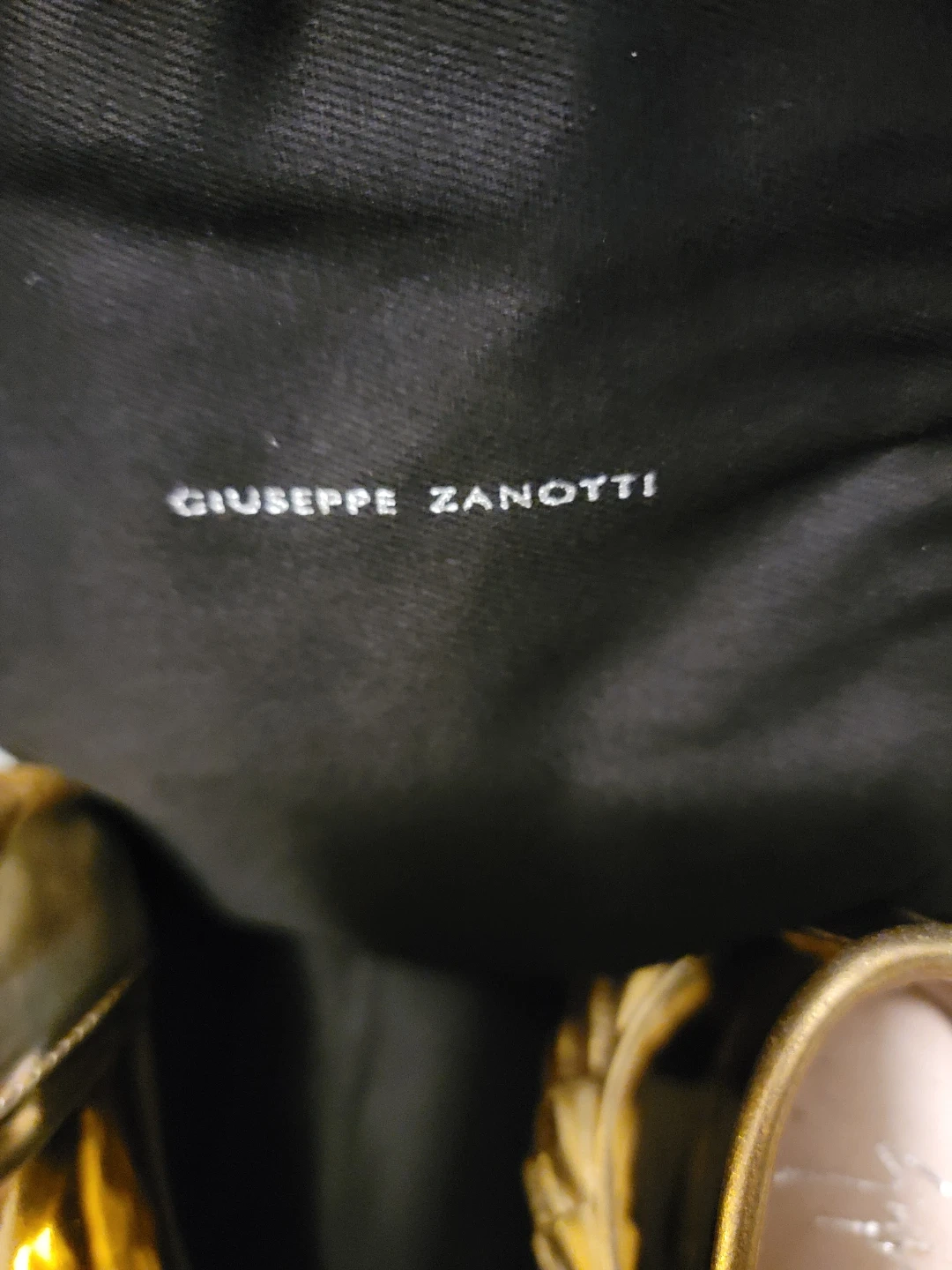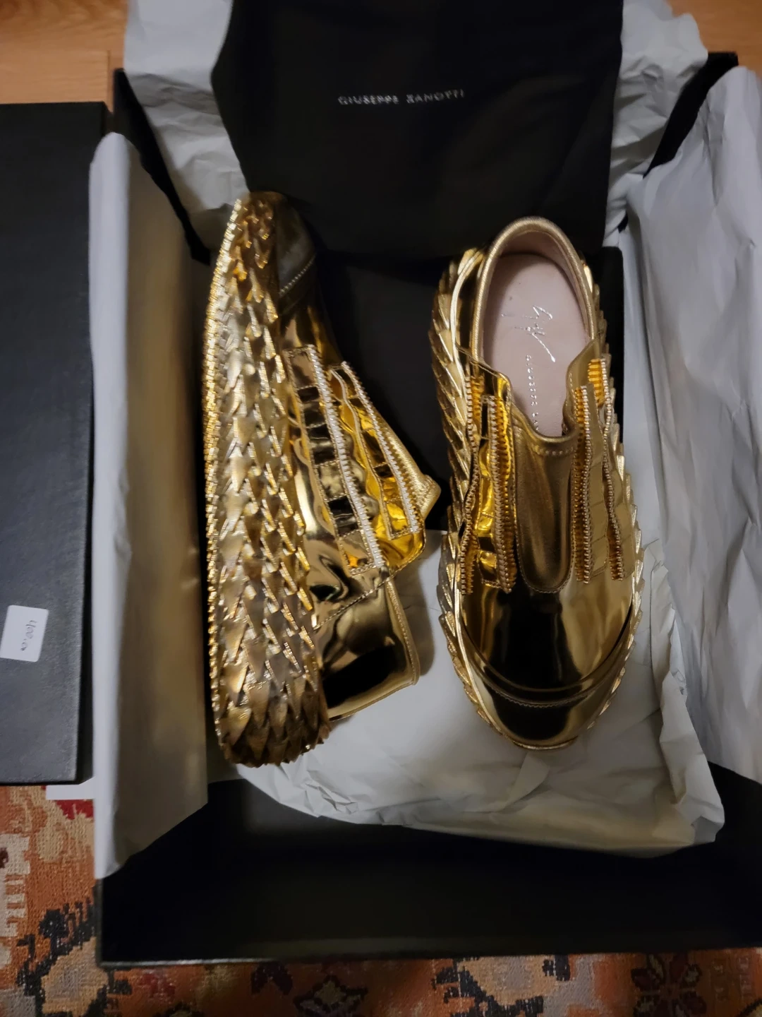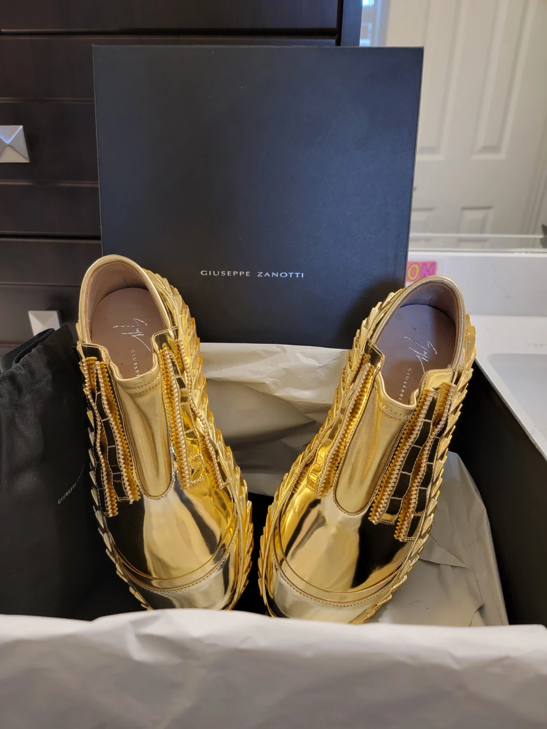 These are shiny gold Giuseppe Zanotti sneakers. They come in the original box with a dust bag. The shoes have a unique zipper detail.
