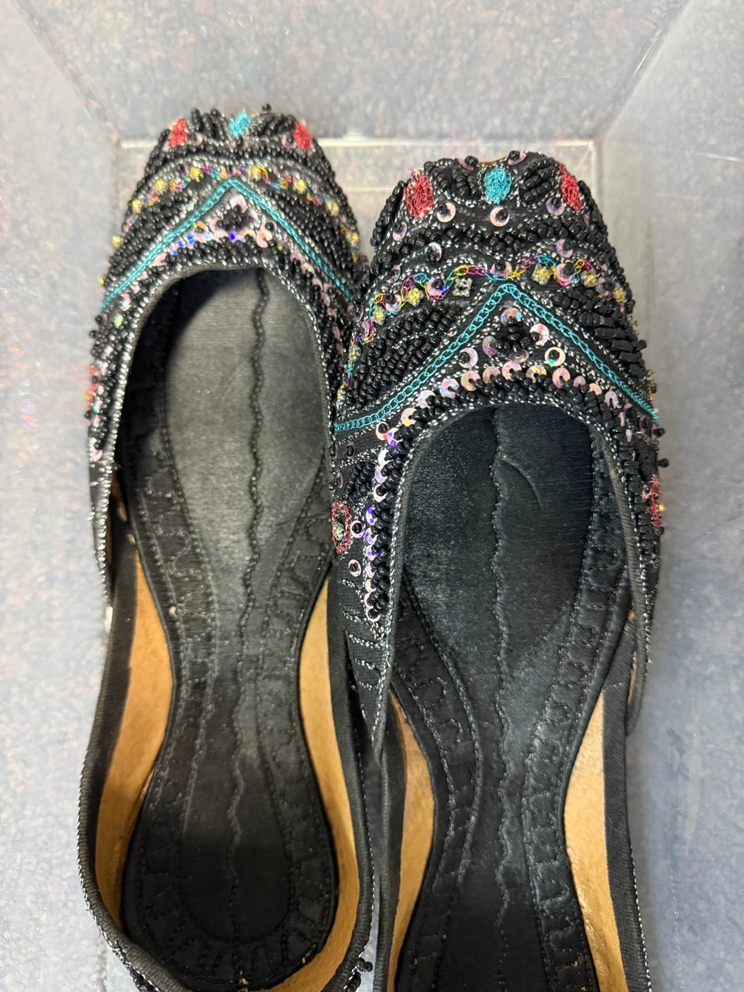 Beautiful black flats adorned with beads and sequins. These are stylish slip-on shoes perfect for adding some sparkle to your outfit. The interior is black with a tan sole.