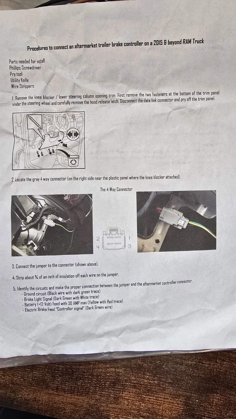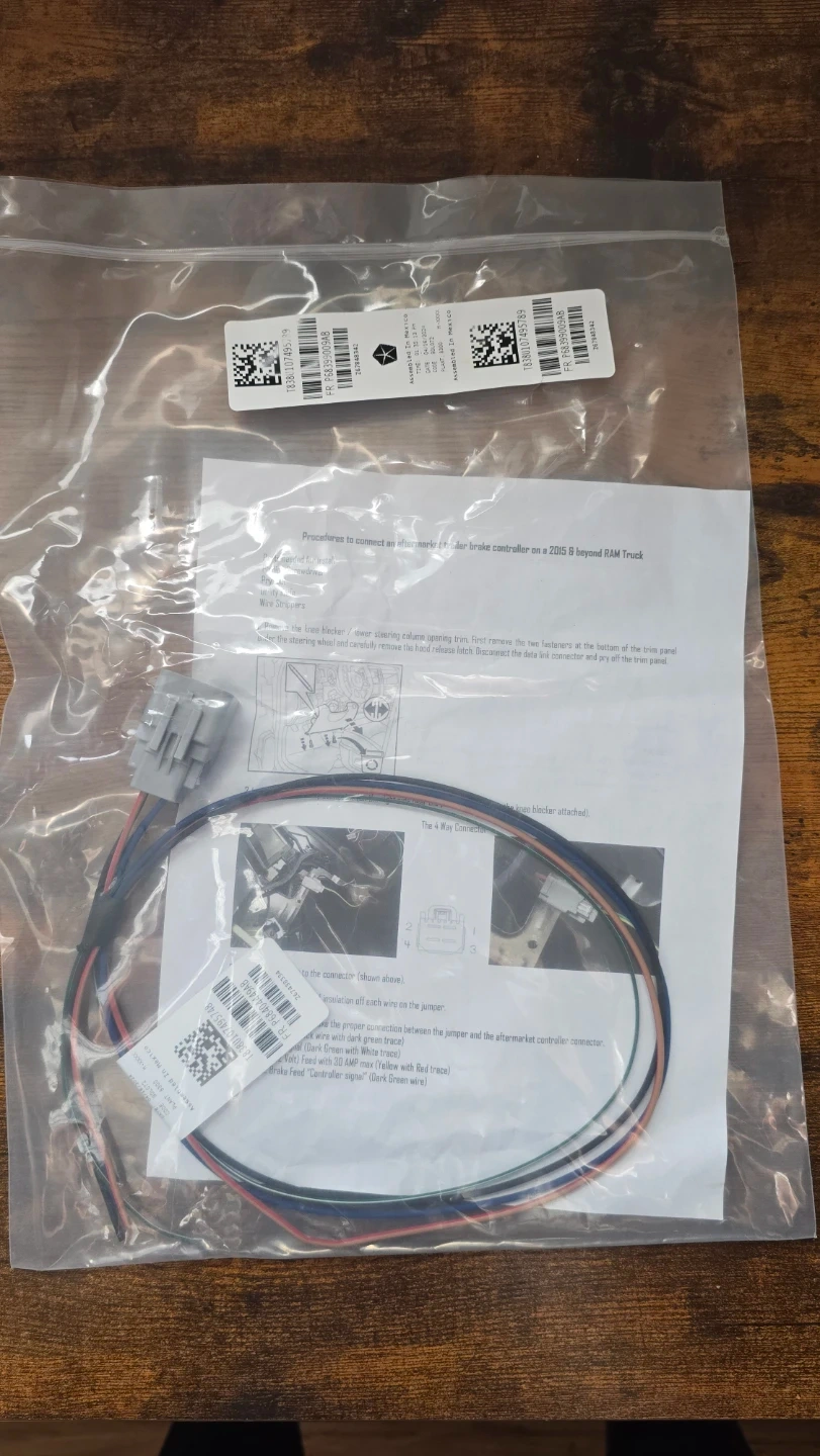 This wiring harness is for connecting an aftermarket trailer brake controller on a 2015 & beyond Ram Truck. It includes the necessary connector and wires for installation.