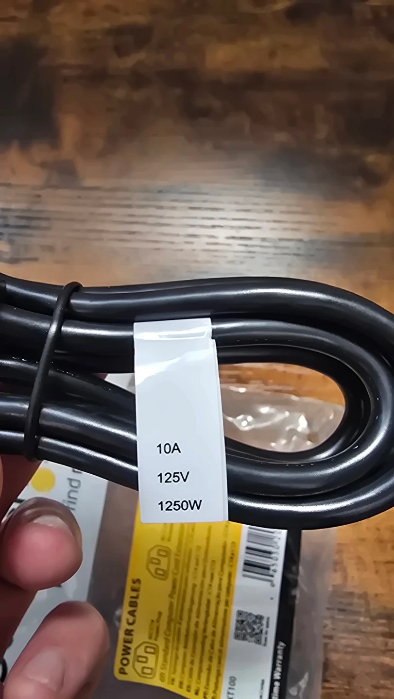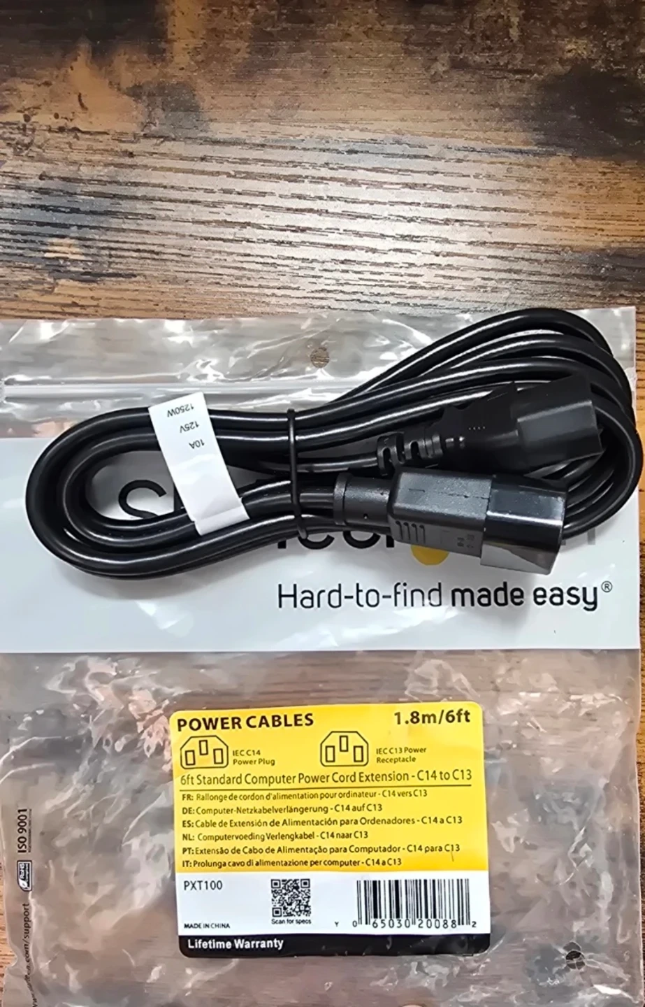 This is a 6-foot power extension cable. It's rated for 10A, 125V, and 1250W. The cable has an IEC C14 plug on one end and an IEC C13 receptacle on the other.