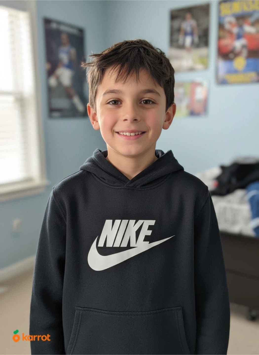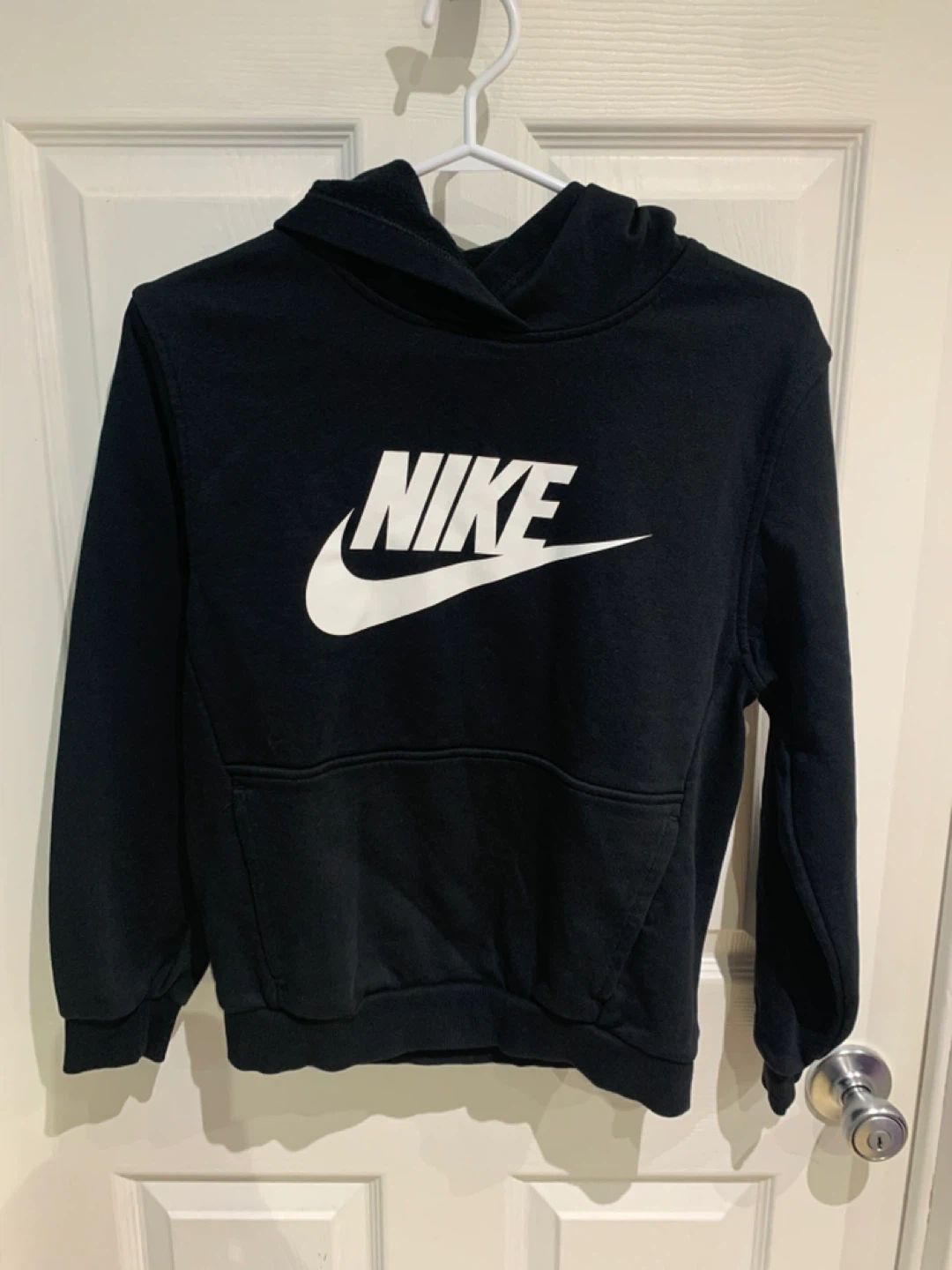 This is a black Nike hoodie with a large white swoosh logo. It's made in Cambodia. The size is L G which is a youth large. It's a pullover style with a front pocket.
