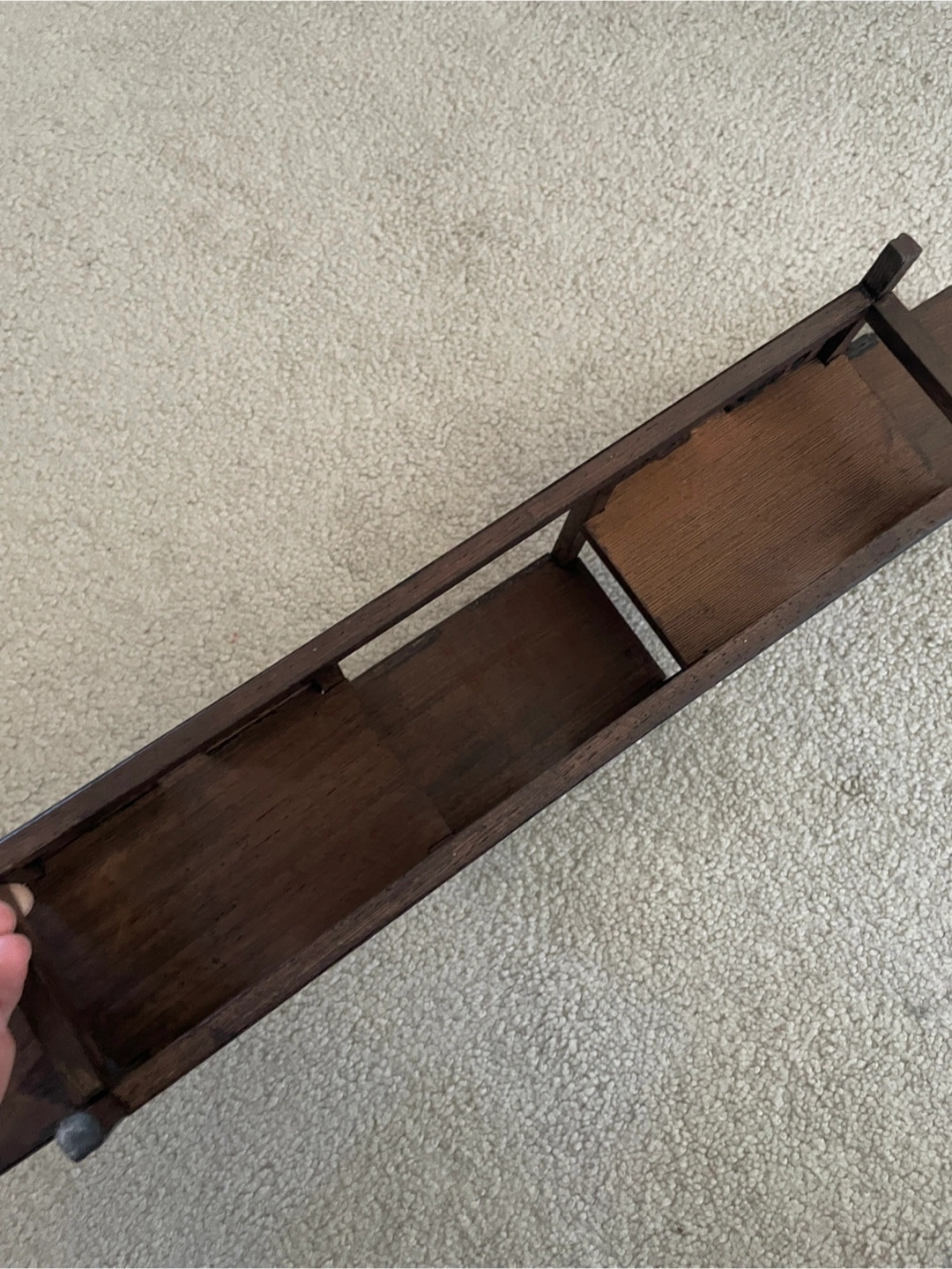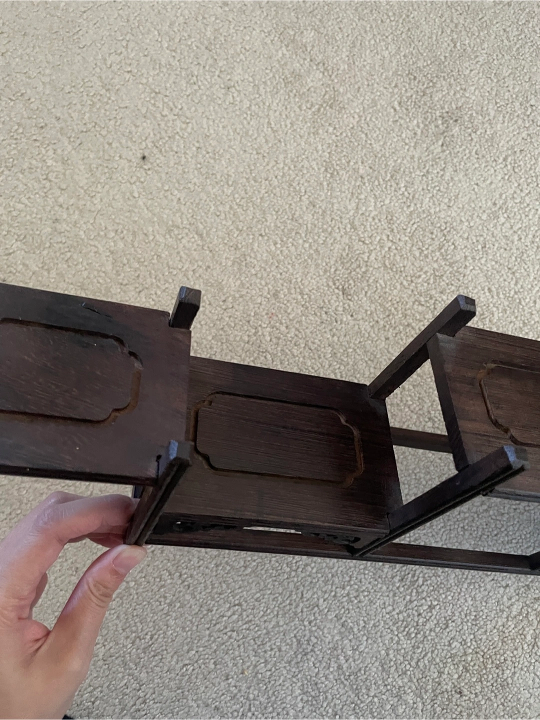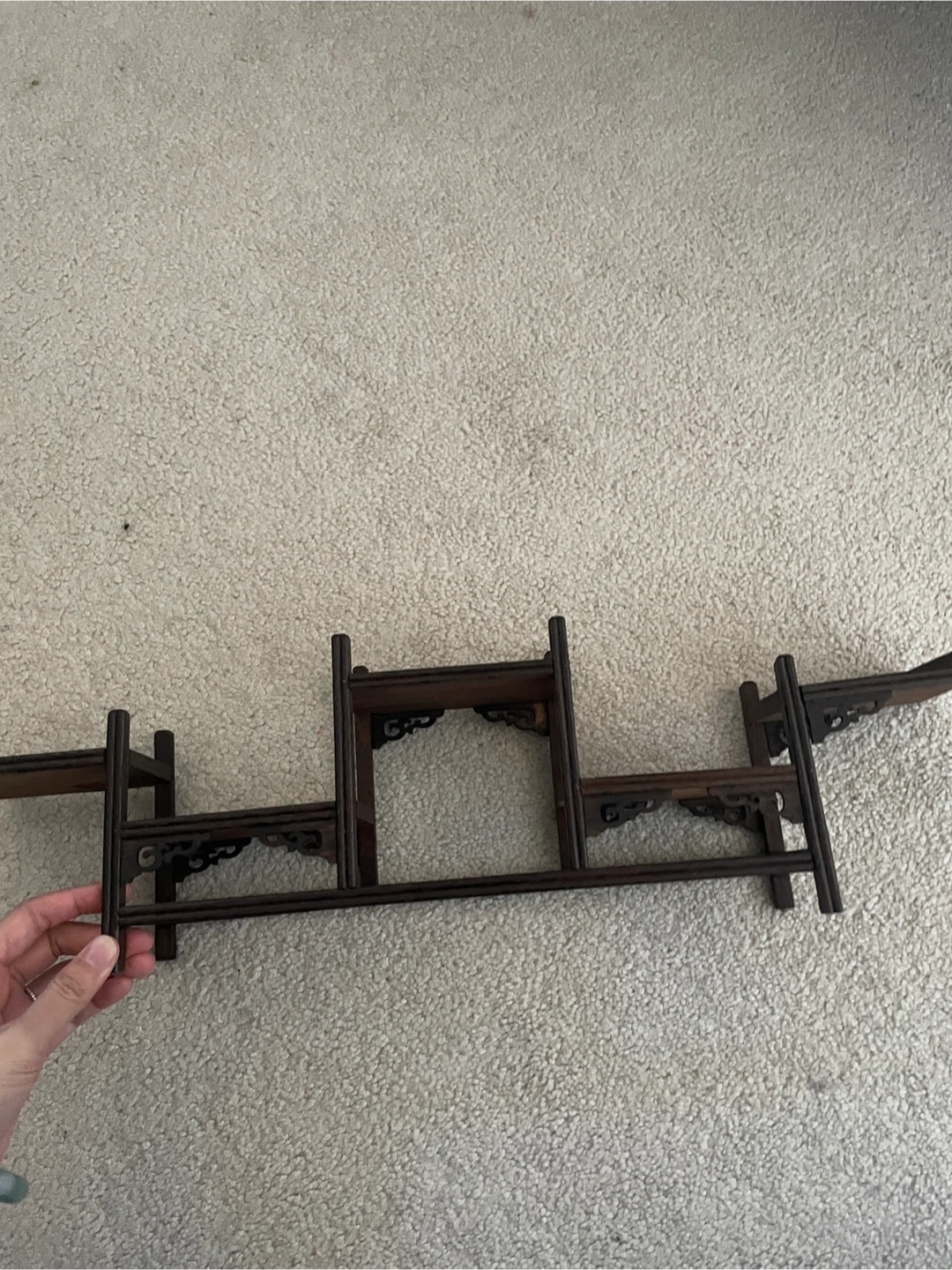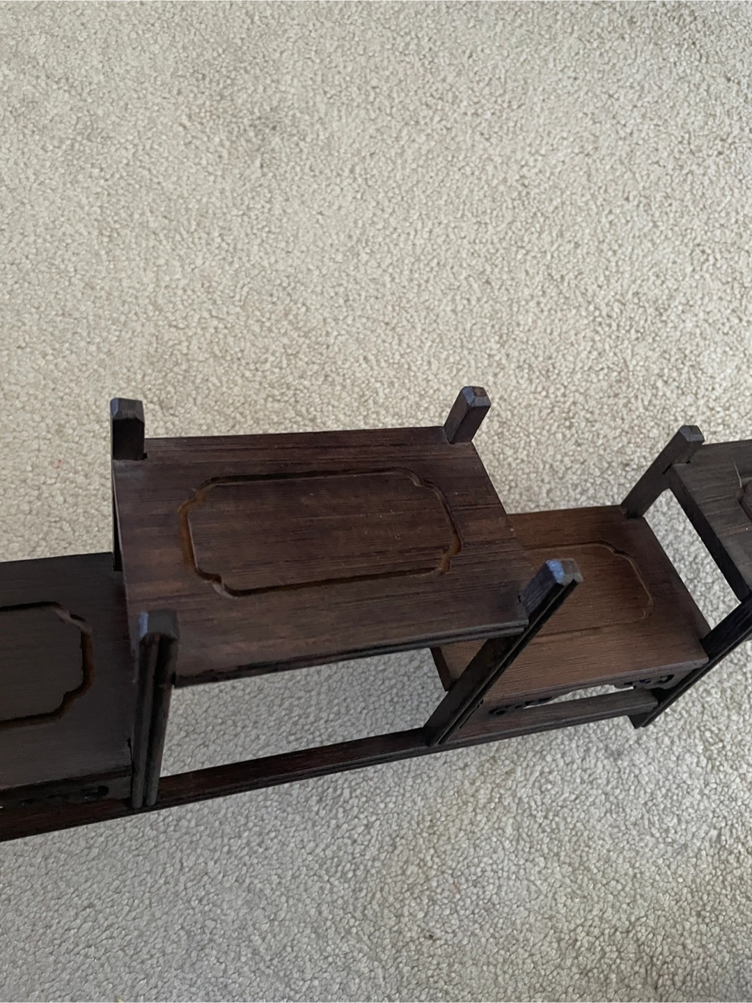 Dark wood tiered shelf with decorative cutouts. It's a lovely piece for displaying small items like plants or collectibles. Perfect for adding a touch of elegance to any room!
