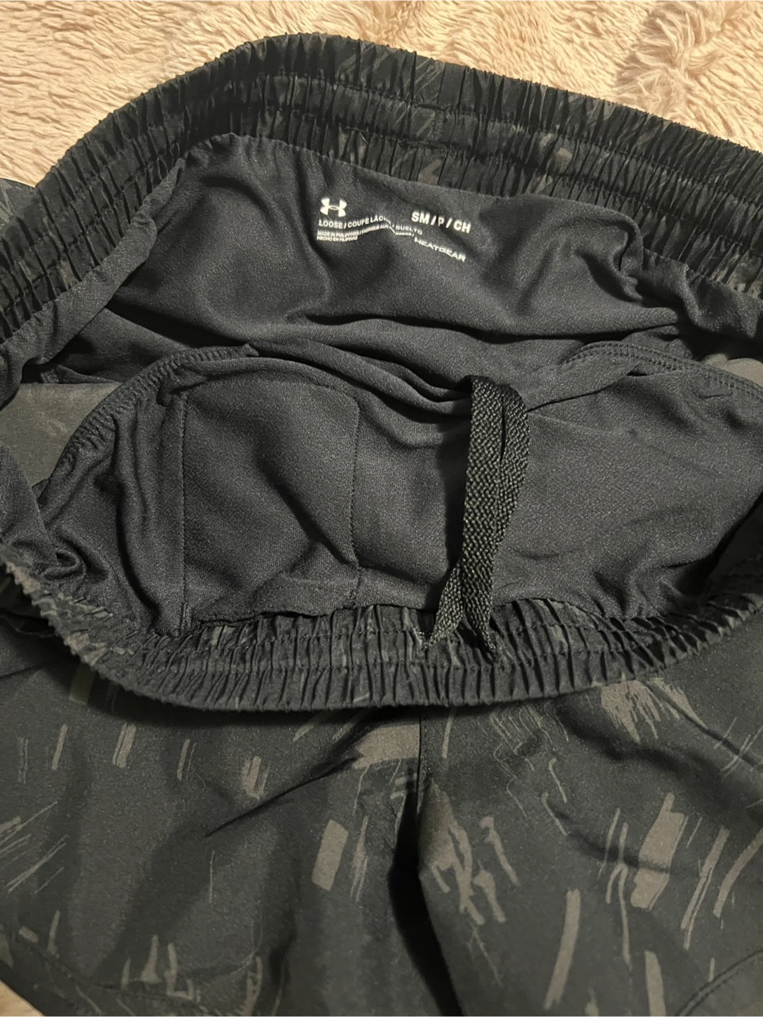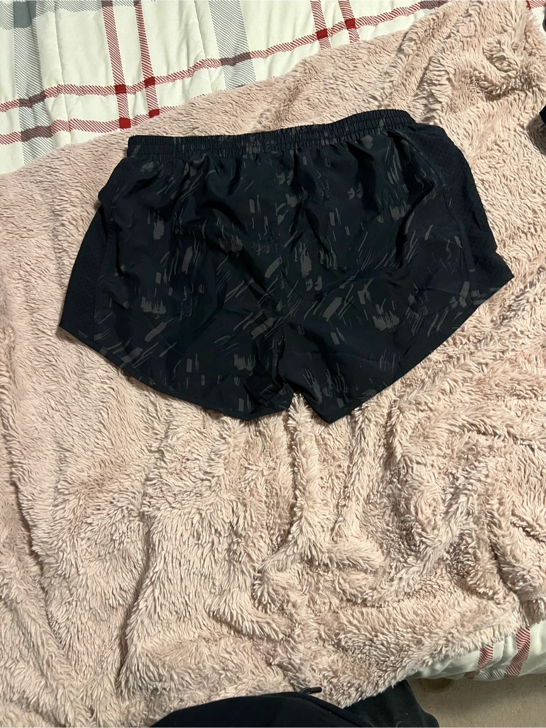 These black Under Armour running shorts are designed for performance. They feature a comfortable elastic waistband with a drawstring and a subtle all-over pattern. Made with lightweight material for breathability during workouts.