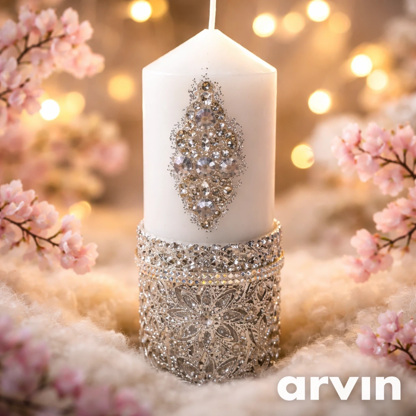 Arvin White Pillar Candle with Rhinestone Embellishments