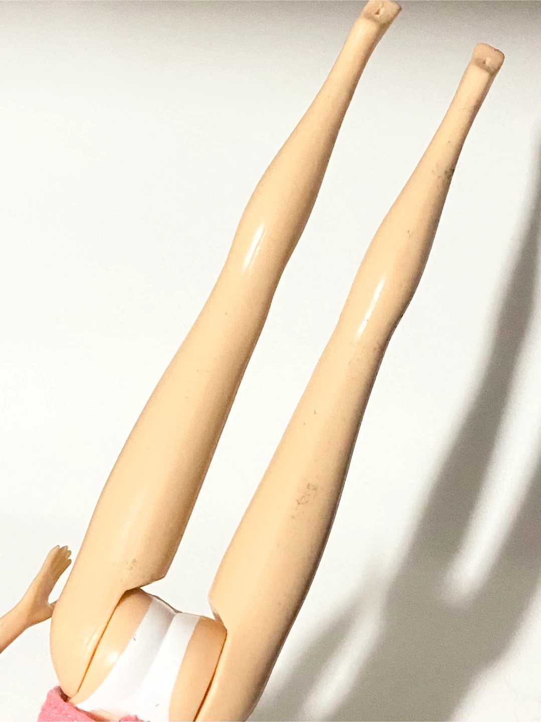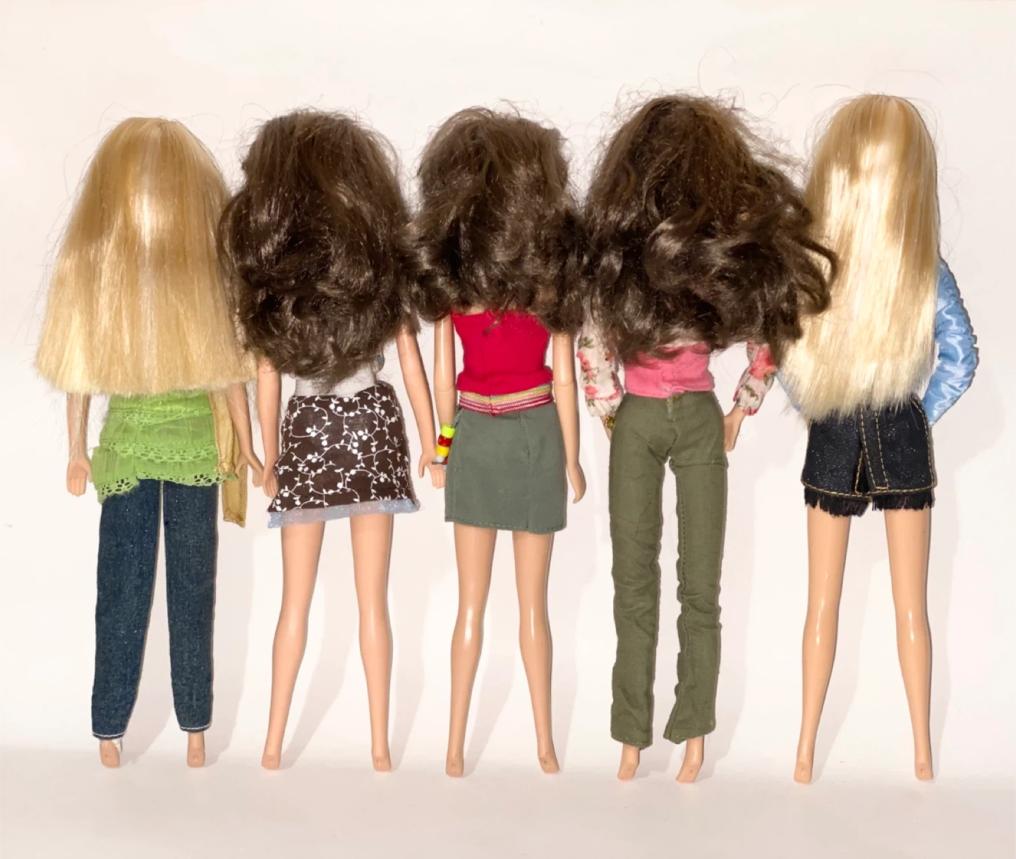 This is a lot of five fashion dolls. They have varying hairstyles and outfits. Some scuffs and stains are present on the legs.