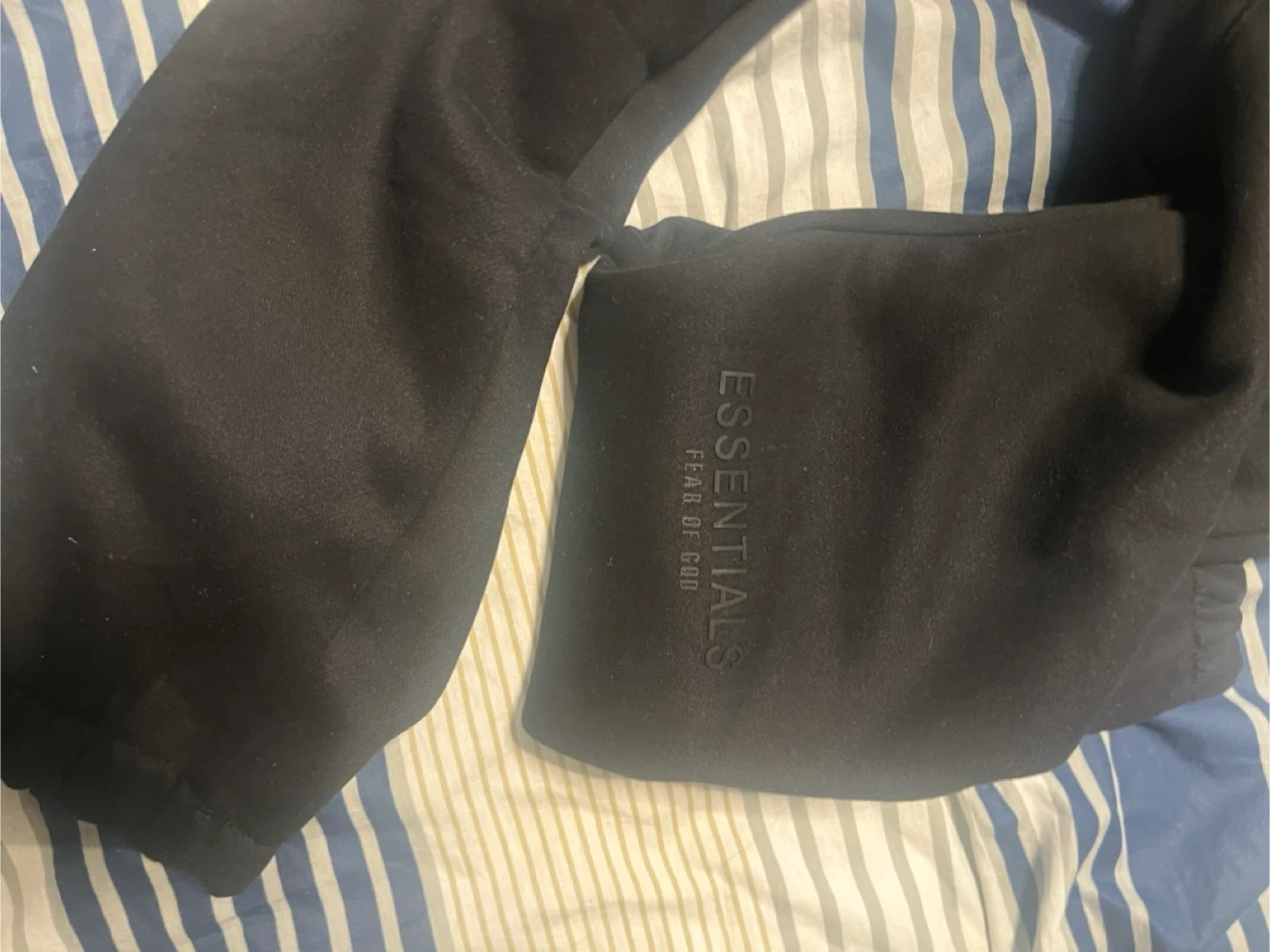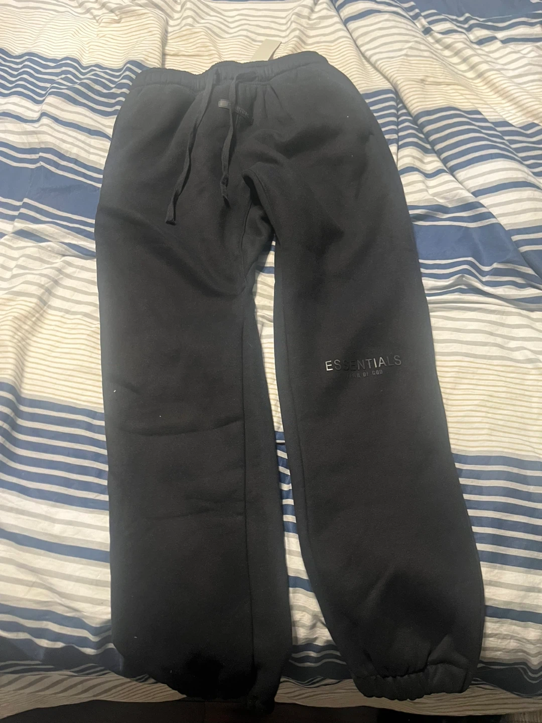 These black sweatpants are from Fear of God Essentials. They are a size medium with an elastic waistband and drawstring. Made with a comfortable fabric blend.