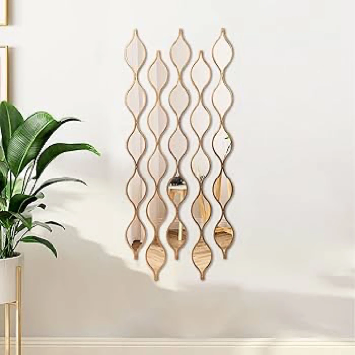 Set of wall mirrors with a unique, cascading design. Gold-toned frame. Adds a modern touch to any room.