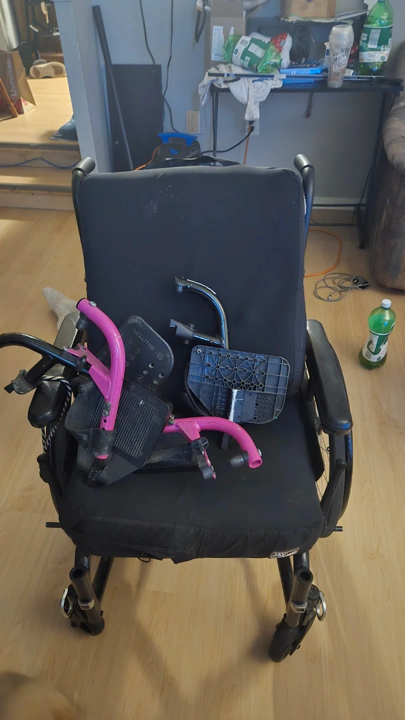 This is a black wheelchair with pink accents and removable footrests. It appears to be a standard adult-sized wheelchair. It's a functional mobility aid.