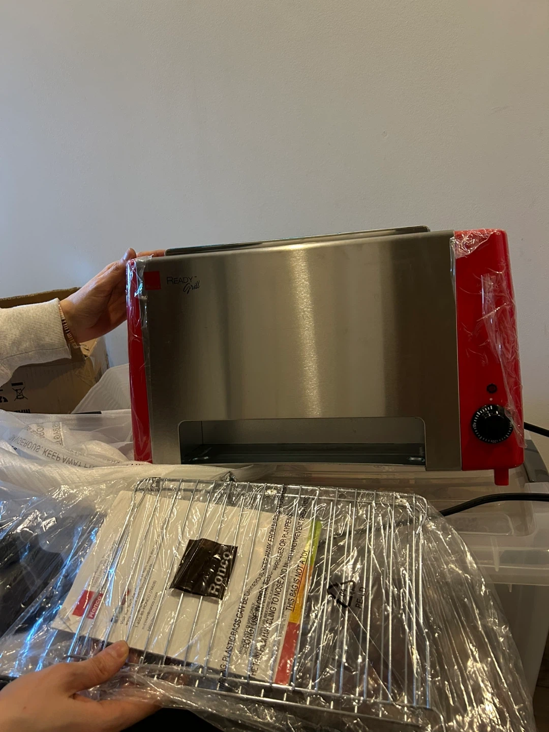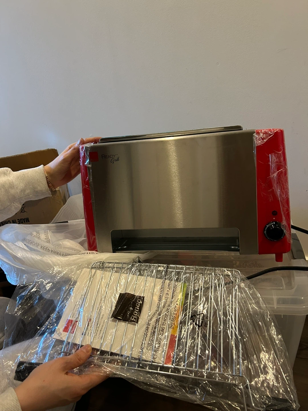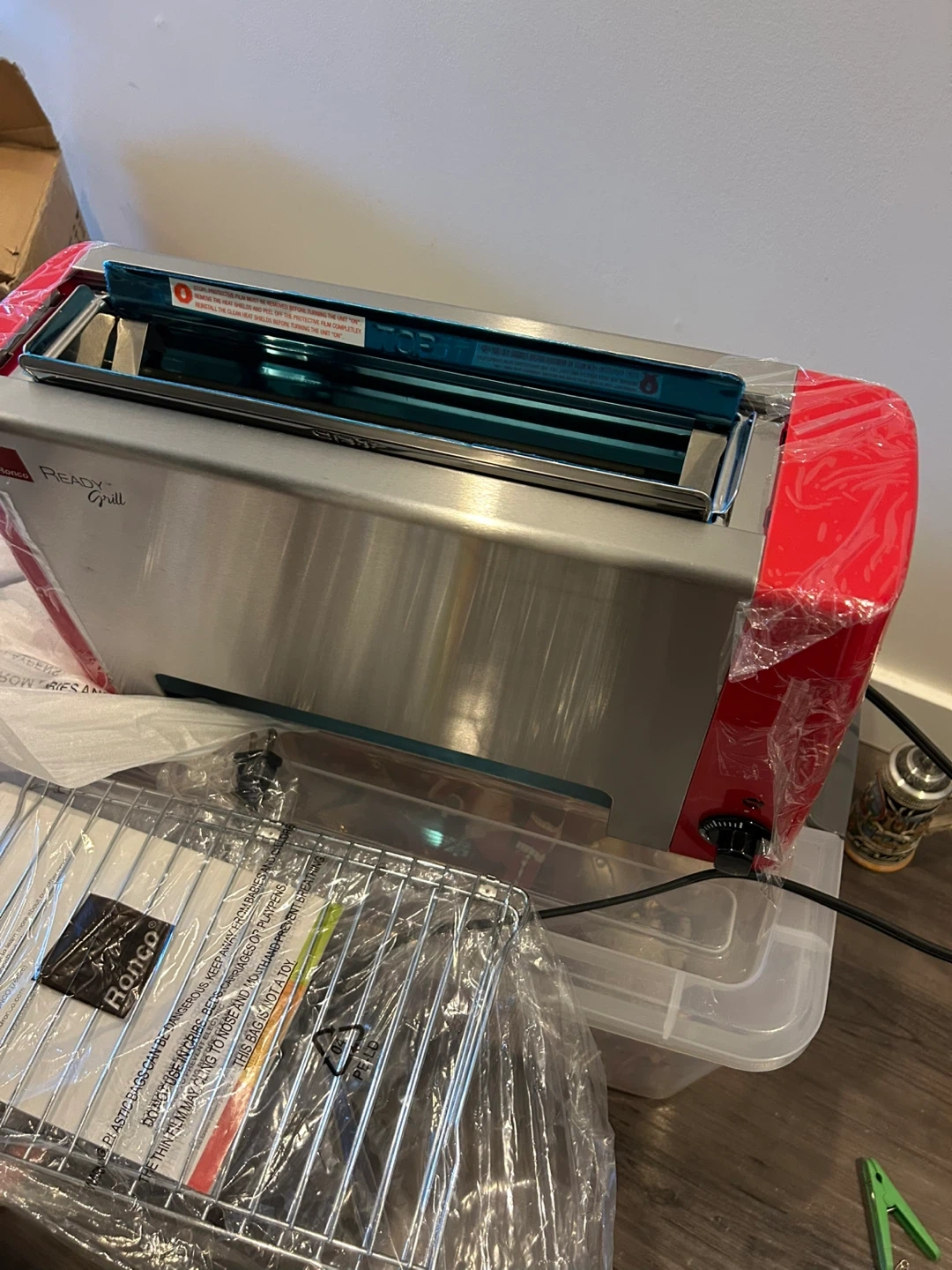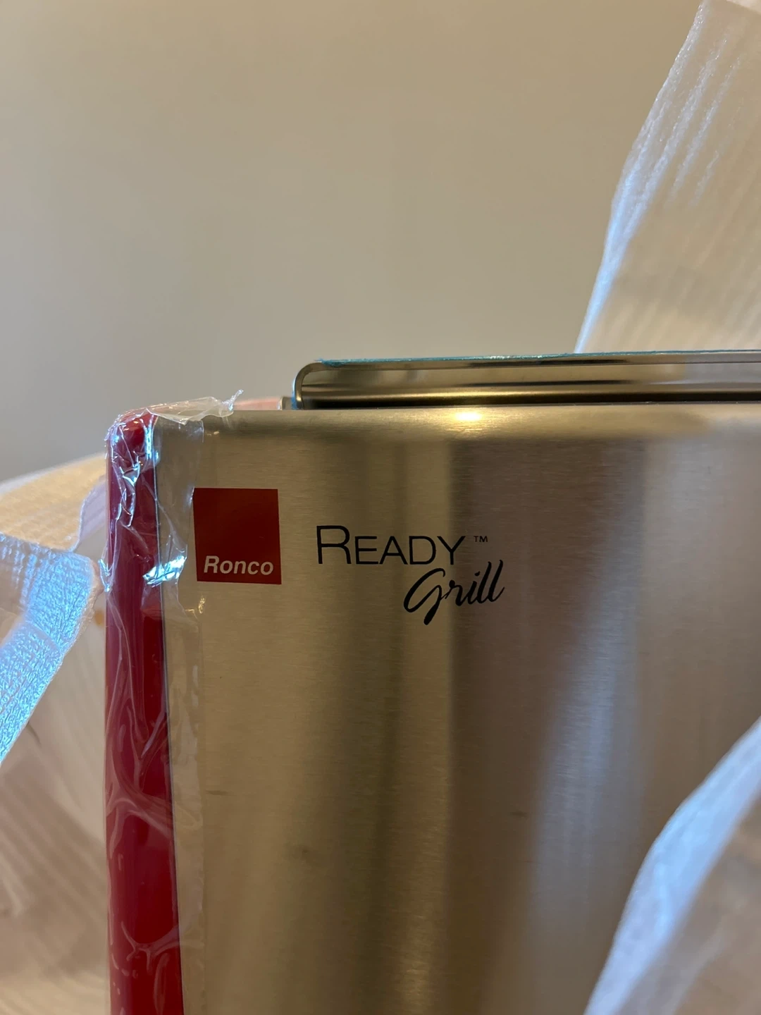 NEW $117. This is a Ronco Ready Grill, an indoor electric grill. It comes with a removable rack and has a stainless steel and red exterior. It's perfect for grilling indoors when the weather outside isn't cooperating!